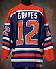 On the back inside collar is the "CCM/Maska" manufacturer's flag tag with wash instructions and size "54" on it. Written above this tag is "90/91-2." On the inside back is the original fight strap. On the front is the large "Oilers" logo in blue on white with orange tackle twill. On the back and on both sleeves is the player number "12" in orange on blue on white triple tackle twill. Across the back is the player name "GRAVES" in white tackle twill on a blue nameplate. There are numerous hit marks on both sleeves and on the front and back bottom. The jersey shows game-use and appears to have no alterations of any kind. Accompanied by a LOA from Milt Byron