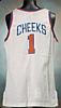 On the left front tail of the jersey is the "Champion" New York Knicks exclusive tag with "YEAR 90" and "BODY LENGHT +2". Next to this is the "Champion" manufacturer's tag with the jersey size "42" on it. On the inside back collar of the jersey is the "Cosby" distributors tag. Across the front of the jersey is "NEW YORK" in orange on blue tackle twill. Below that and on the back is the player number "1" in orange on blue tackle twill. Across the back is "CHEEKS" in blue tackle twill. On the left breast is the official "NBA" embroidered logo. The jersey shows good game-use and appears to have no alterations of any kind.