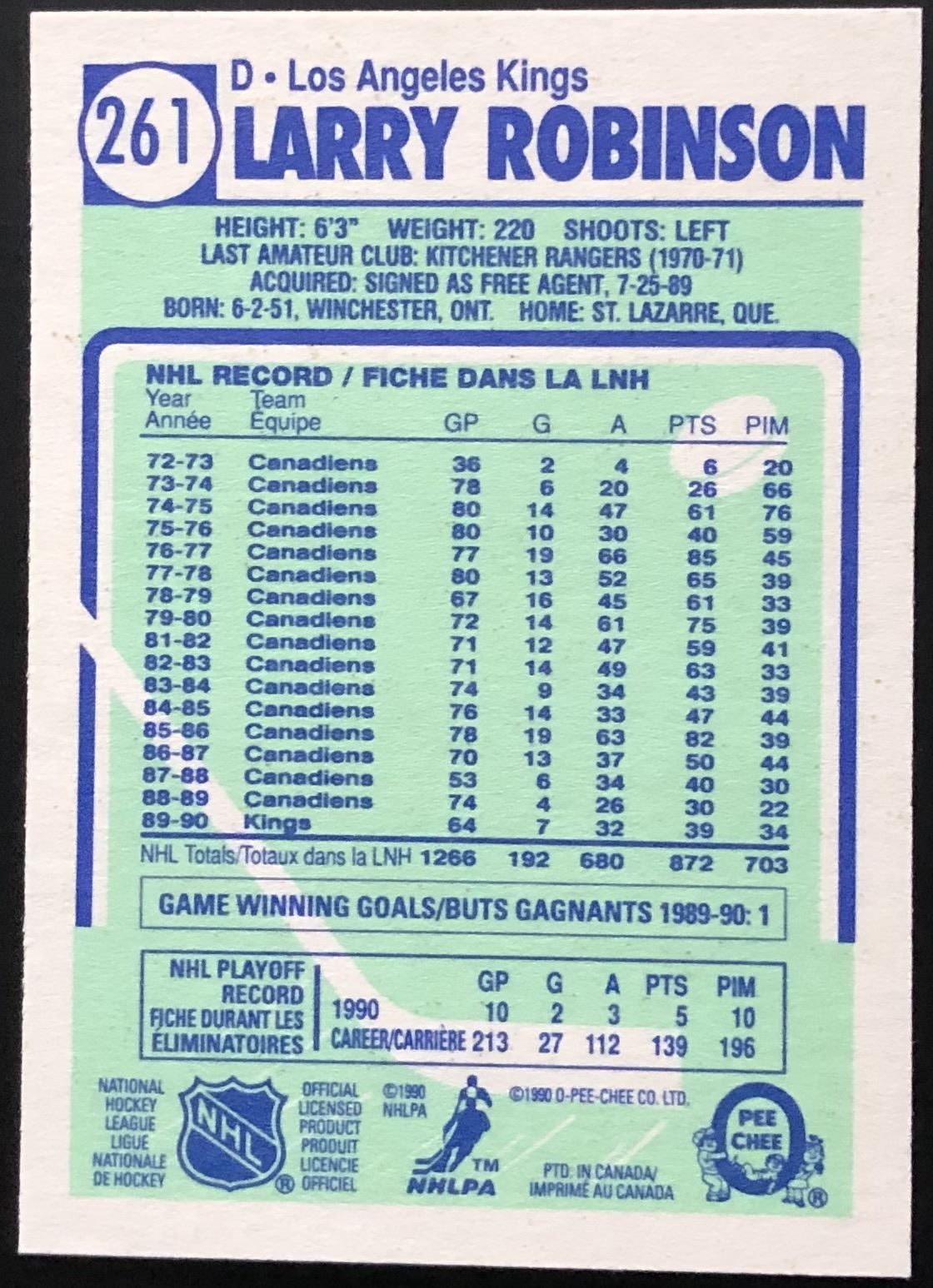Card #261 NHL, hockey, OPC, hall of fame