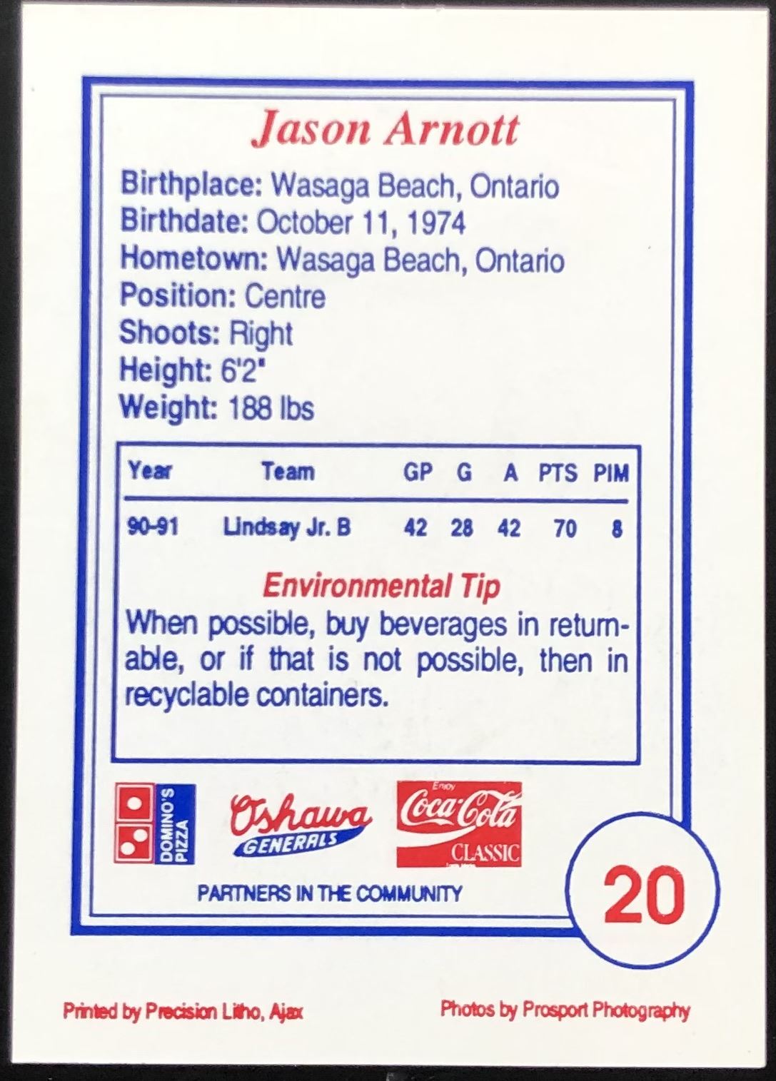 Card #20, Oshawa Generals team set issued by Domino's Pizza CHL, OHL, junior, rookie, regional, hockey