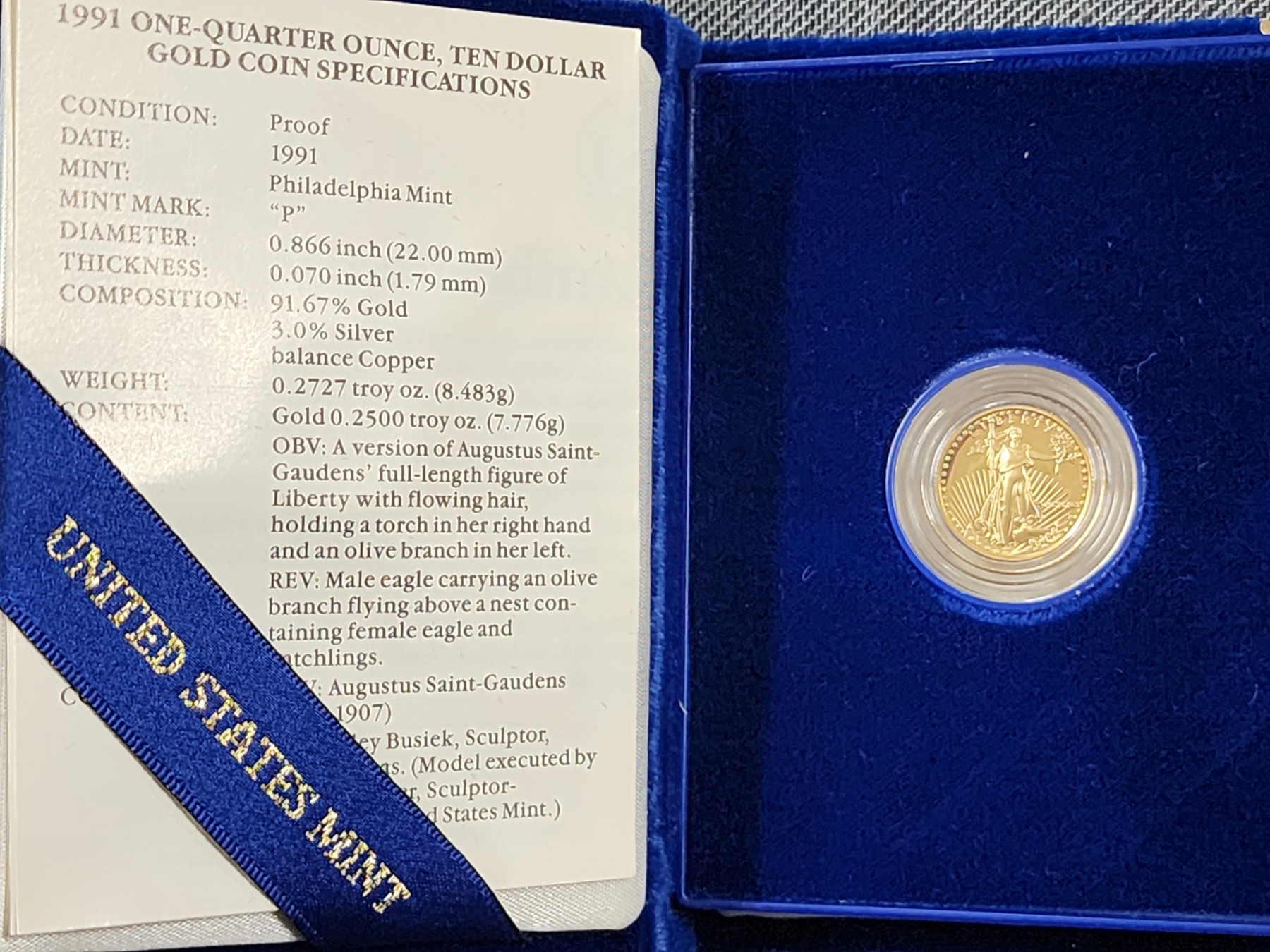 1991 One Tenth Ounce PROOF $5 American Eagle Gold Bullion Coin - 1/10th OZ OF GOLD!