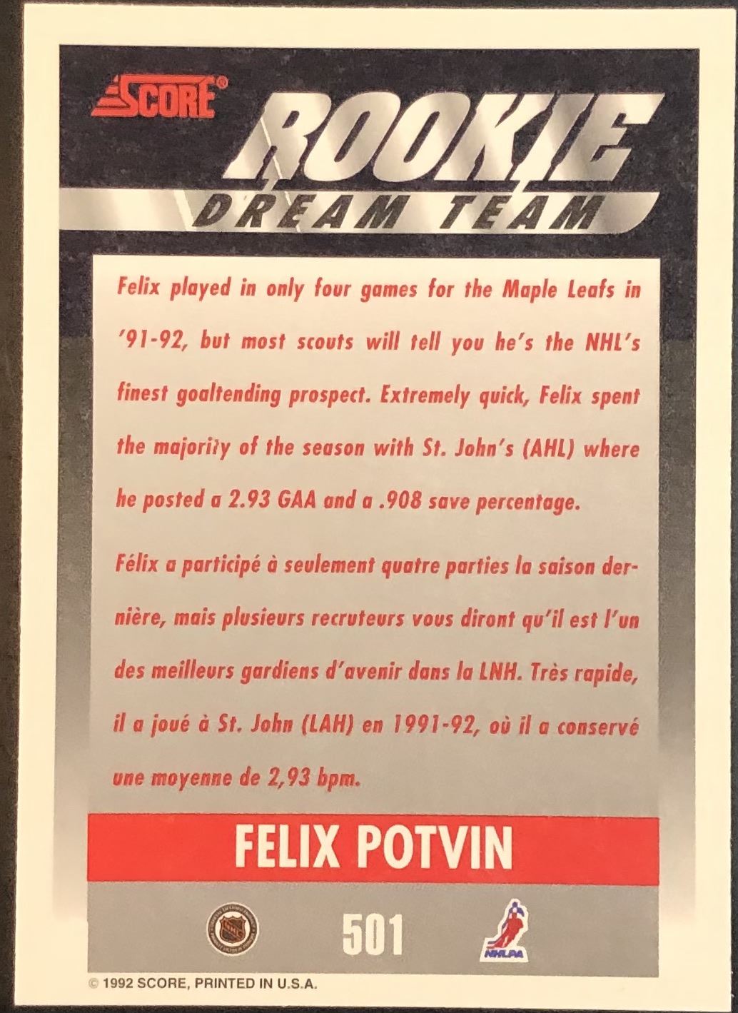 1992-93 SCORE FELIX POTVIN ROOKIE CARD