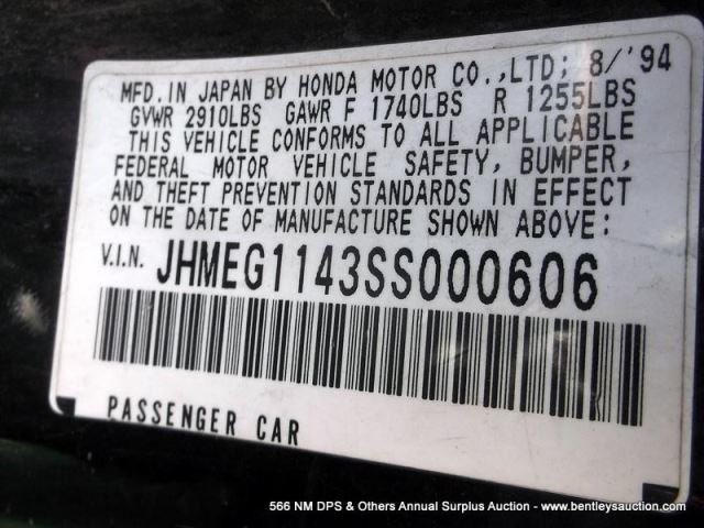 1995 HONDA CIVIC DEL SOL ~ 204,557 MILES VIN: JHMEG1143SS000606, COUPE, FWD, I4, 1.5L, BLACK, WINDSHIELD CRACKED, A/C HOT, 1/4 TANK GAS, **NEEDS JUMP**, CSFDWI, “these vehicles are seized due to a DWI related offense, the previous owner cannot repurchase