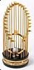 Known as the greatest franchise in the history of sports, the NY Yankees have fielded immortal teams in every era. In 1996, the Yankees once again made New York City a magic place in the month of October by defeating the Atlanta Braves in the World Series to bring home the first Championship since 1978 and the first of four over the next five years. This World Series trophy is an exact copy of the one presented to the NY Yankees upon winning the World Series in 1996. 27" tall at the highest flag, the trophy features a gold crown atop an arc centerpiece over a silver baseball, surrounded by 28 gold flags with black lettering on stanchions, one for each Major League team. The two World Series teams' press pins (Yankees and Braves) are mounted on small poles on the 12" diameter black base, in front of the silver baseball. The surrounding gold band reads "World Championship Trophy, Presented By The Commissioner Of Baseball." In overall EXMT-NRMT condition with only the slightest tarnishing on the flags. This item will be expensive to ship.