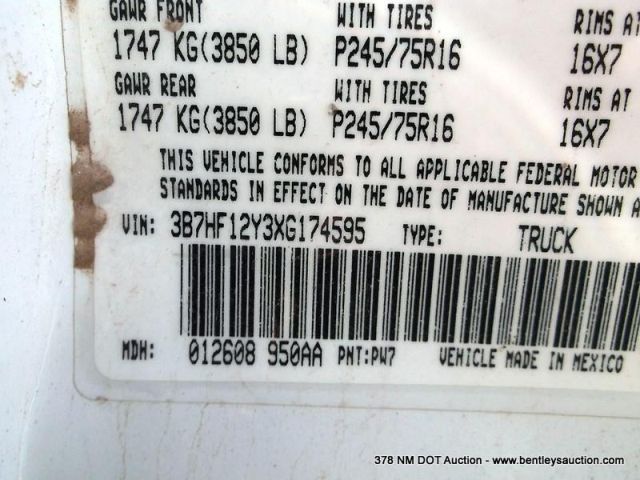 1999 Dodge Ram Pickup 1500, 4WD, 270,434 Miles VIN:3B7HF12Y3XG174595, Pickup, 4WD, V8, 5.2L TITLE # 132211GSD988576 3 KEYS FA37515