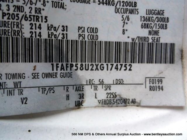 1999 FORD TAURUS WAGON ~ 103,560 MILES VIN: 1FAFP58U2XG174752, FWD, V6, 3.0L, WHITE, AC COOL, 1/4 TANK GAS, LEFT FRONT FENDER REMOVED & IN BACK OF CAR, CSF TITLE #: 16203134A969209 2 KEYS FA-27045 G39925