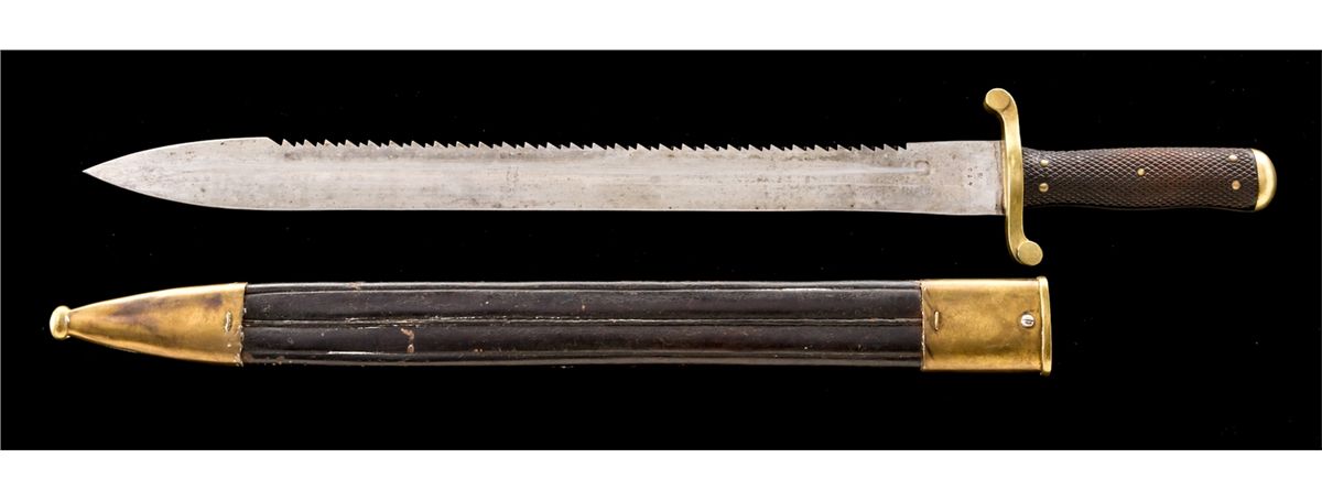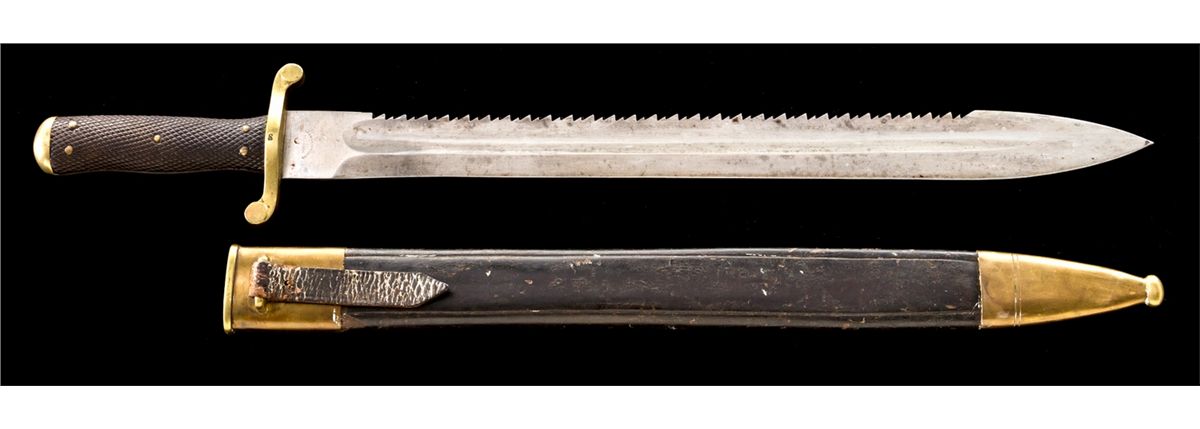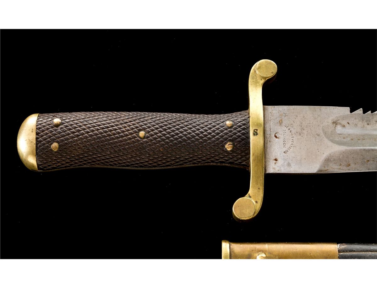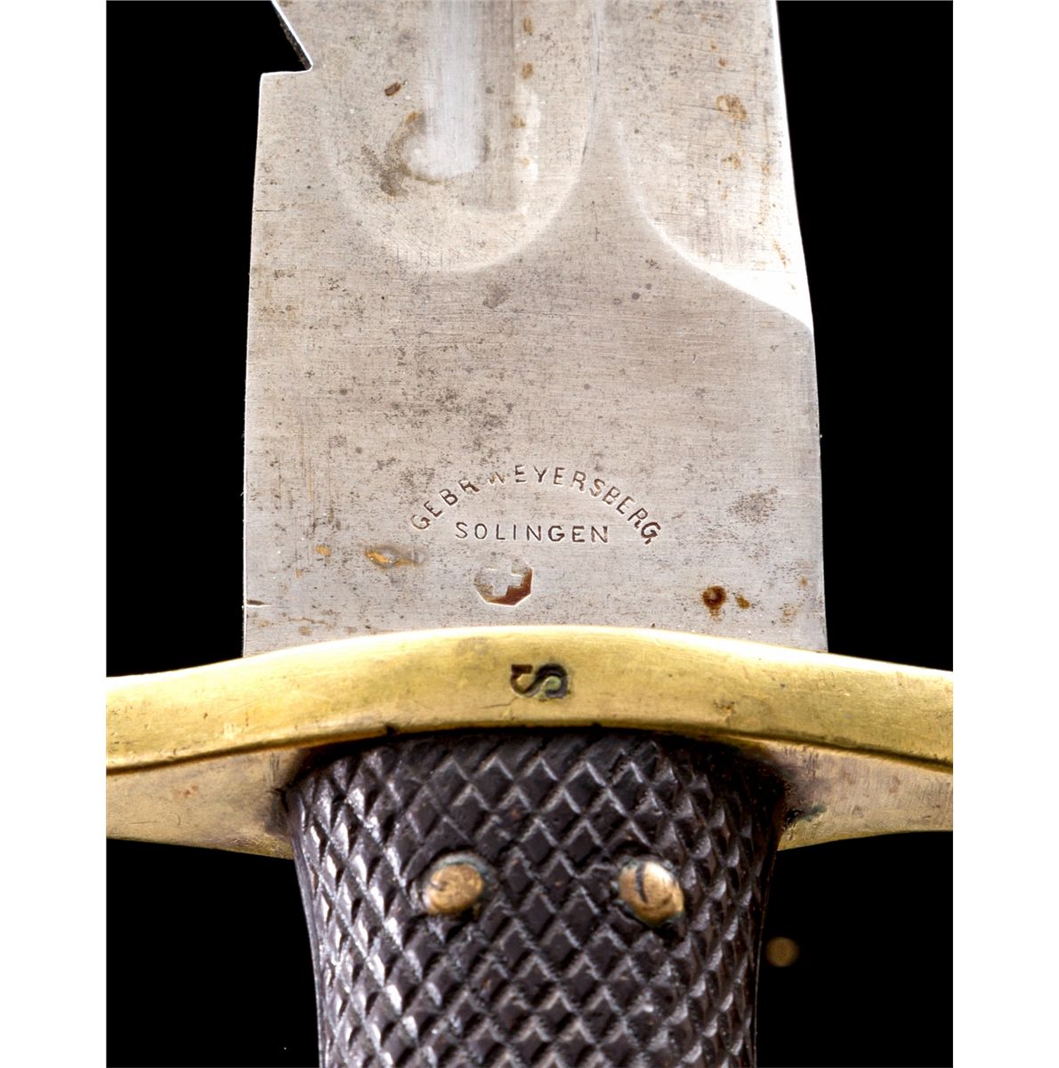 19th Century German Made Swiss Engineer's Short Sword, by Gebr. Weyersberg, Solingen. 19-7/8'' sawback blade, with an overall length of 25-1/2''. Ricasso is marked ''473'' and ''78'', with the reverse marked ''Gebr. Weyersberg/Solingen''. Also marked with a ''Swiss Cross''. Brass pommel, checkered grips with brass pins, and a brass guard that is marked with the letter ''S''. Black leather scabbard with brass throat and chape. Condition is very good overall. Blade with patches of light carbon spotting, sawback remains sharp. Brass parts with light toning. Leather scabbard with scuffs and scratches. Est.: $250-$350.