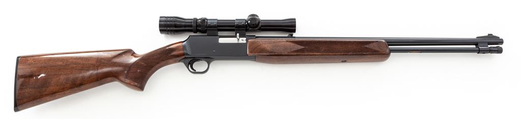 1st Year Browning BAR-22 Semi-Automatic Rifle, with Redfield Scope, #07642RR166, .22 LR cal., 20.25'' barrel, blue finish, and factory grooved receiver. Gloss-finished pistol-grip walnut stock with checkering at the wrist and forend, and factory black plastic Browning buttplate. Sights include a brass bead blade front dovetailed into a ramped base, and folding rear sight. Mfg'd 1977, in Japan. Topped with a Redfield 1-3/4X-5X scope and Weaver rings; scope with a fine crosshair reticle. Metal surfaces rate as excellent with approx. 99% factory blue finish. Wood is very good with scattered shallow impressions and other small handling marks, with the highest concentration being visible on the bottom edge of the forend; checkering is mostly sharp, right side of pistol grip with a spot of light wear to the checks. Nice smooth action and excellent bore. Scope exterior with a few slight scratches, optics are clear. Est.: $500-$700. (Modern)