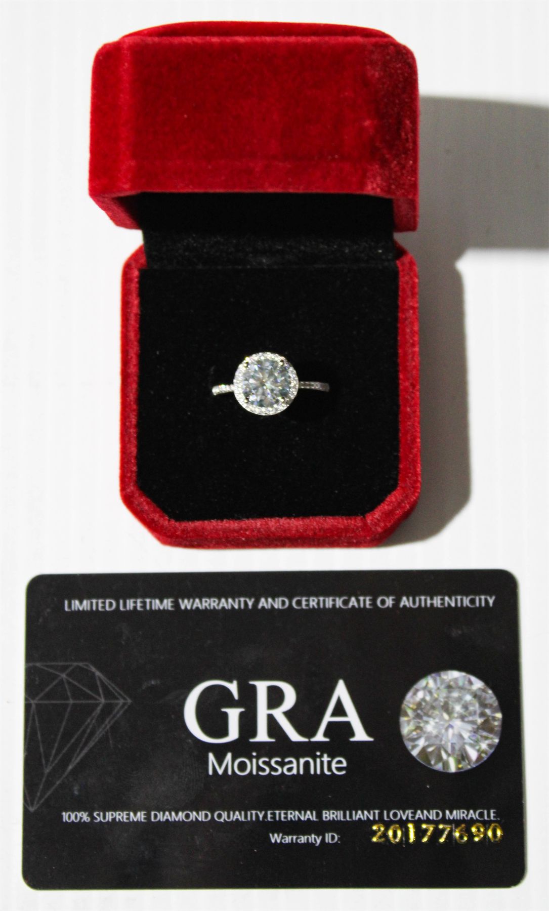 2.0 CARAT GRA CERTIFIED APPRAISED VALUE $2,100.00 MOISSANITE VVS D SET IN .925 SILVER WITH 35 CUBIC ZIRCONIUM IN HALO WITH MORE IN SHANK OF RING, SIZE 7