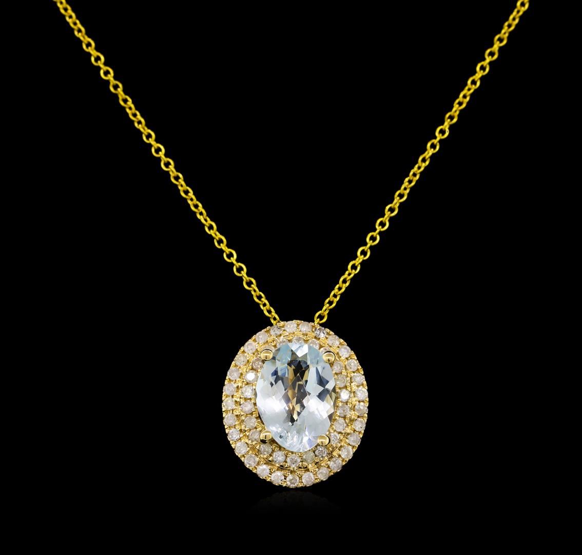 One electronically tested 14KT yellow gold lady's combination cast & assembled fashion pendant & chain 18.0" long, 1.3mm round cable link with a spring ring clasp with a basket double halo with a bright polish finish. Trademark is Orianne. Identified with markings of "14K". Condition is new, good workmanship. Containing: One prong set oval modified brilliant cut natural aquamarine, measuring 10.58 x 7.78 x 4.65mm, approximate weight of 2.10 ct., clarity is slightly included, type I, light, very slightly grayish, very slightly greenish blue color, (GIA vslgB 3/3), cut is good. Transmitting light with no distortion, transparent. Colored gemstones are presumed to have been subjected to commonly used enhancement processes. Graded in the setting. Fifty prong set round brilliant cut diamonds, measuring 1.40 - 1.30 x 0.82mm (depth est.) approximate total weight of 50 Stones = 0.46ct. Graded in the setting. Clarity: I-1 to I-2. Color: H - I. Cut Good. Total Weight of Colored Stones 2.10 ct. Total Weight of Diamonds 0.46ct. Total Weight of Pendant & Chain 5.20gm. GAS Appraised.