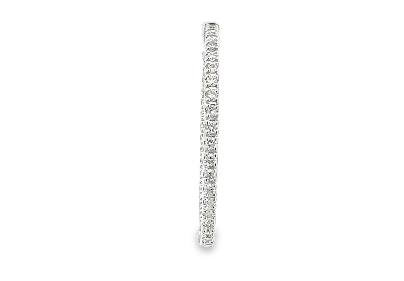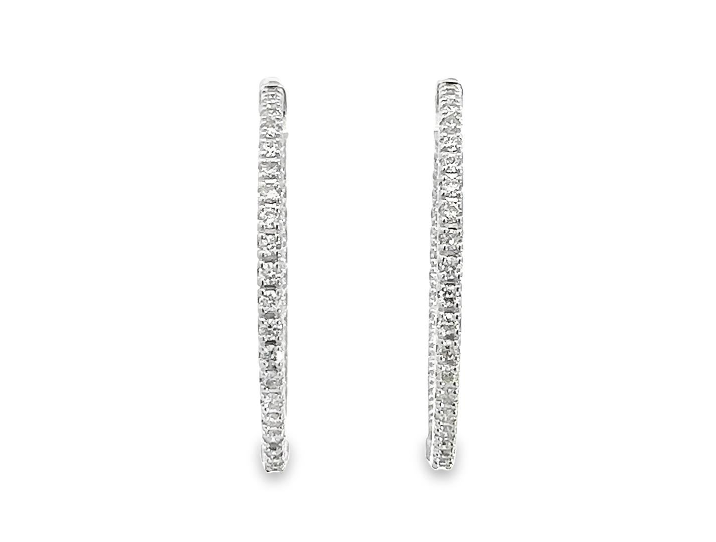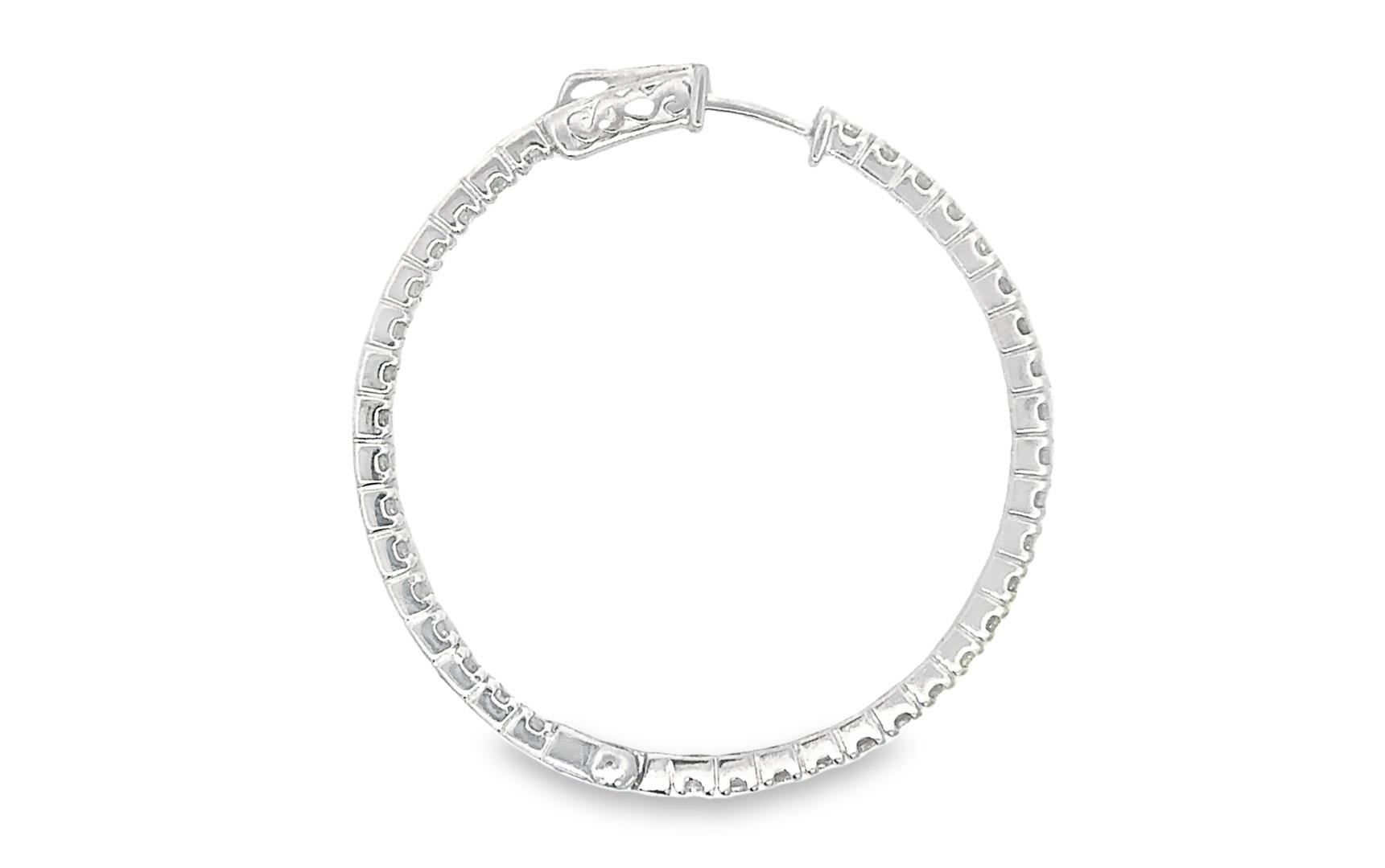 One pair electronically tested 14KT white gold lady's combination cast & assembled fashion inside-out hoop earrings with a bright polish finish. The featured hoop earring has a diameter of 38 millimeter. Identified with markings of "14K". Condition is new, good workmanship. Containing: Seventy-Six prong set round brilliant cut diamonds, measuring 2.10 - 2.00 x 1.32mm (depth est.) approximate total weight of 76 Stones = 2.60ct. Graded in the setting. Color I - J Clarity VS-2 to SI-1 Cut Very Good Total Weight of Diamonds 2.60ct. Total Weight of Earrings 9.40gm Estimated Retail Value $ 7750.00
