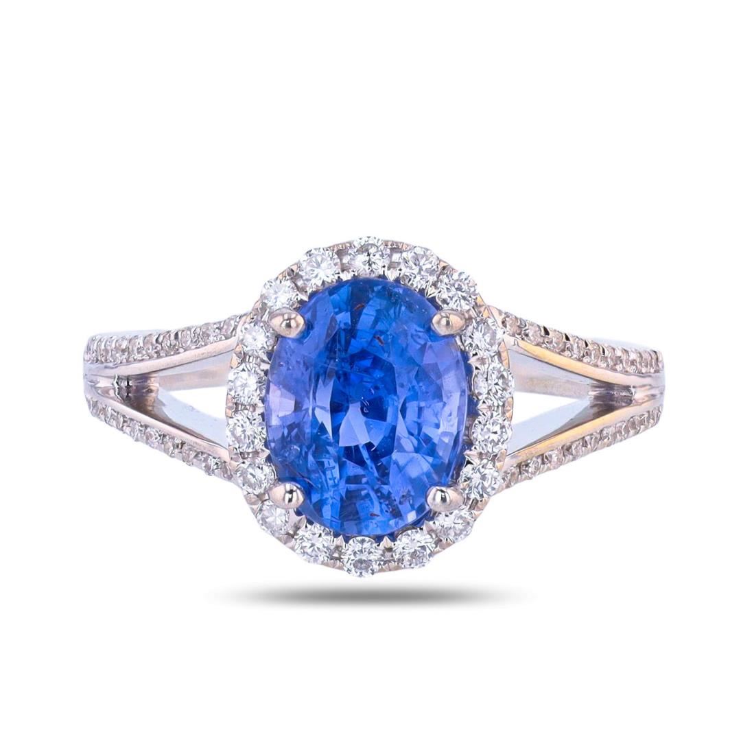 Eighteen karat (18K) white gold natural unheated sapphire corundum and diamond ring. An oval modified brilliant cut natural unheated sapphire corundum gemstone is mounted in the center of the ring. Round brilliant cut diamonds accent the ring on both sides of the center gemstone. The ring has a gross weight of 5.5 Grams. Reference: GIA Sapphire Report 2231552110 #NATURAL GEMSTONE# GEMSTONE: Sapphire Corundum; NATURE: Natural (No Indications of Heating); SHAPE: Oval Modified Brilliant, Faceted Cut; WEIGHT: 2.77 carat total; DIMENSIONS: 8.89 x 7.03 x 5.63mm; CLARITY: Type 3; COLOR: Blue (5/5); SYMMETRY: Excellent; COLOR INTENSITY: Intense; TRANSPARENCY: Transparent; TONE: Dark #NATURAL DIAMOND# SHAPE: Round Brilliant Cut; WEIGHT: 0.34 carat total (58pcs.); DIMENSIONS: 1.6 x 0.9mm; AVERAGE CLARITY: VS1-VS2; AVERAGE COLOR: F-G; SYMMETRY: Excellent; POLISH: Excellent #METAL# METAL: Gold; PURITY: 18K (750); COLOR: White; CONDITION: Excellent; FINISH: High Polish #Size: 6 3/4