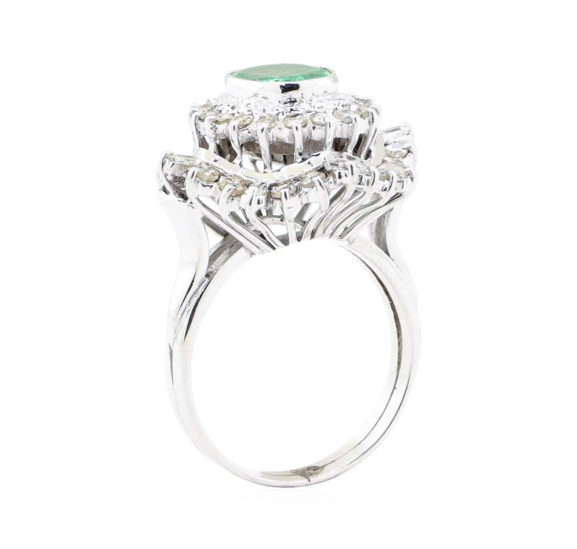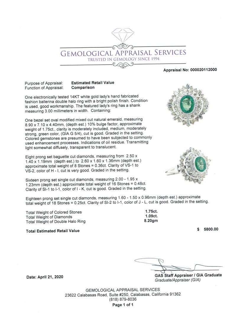 One electronically tested 14KT white gold lady's hand fabricated fashion ballerina double halo ring with a bright polish finish. The featured lady's ring has a shank measuring 3.00 millimeters in width. Condition is Good. Containing: One bezel set oval modified mixed cut natural emerald, measuring 8.90 x 7.10 x 4.40mm, (depth est.) 10%. bulge factor, approximate weight of 1.75ct., clarity is moderately included, medium, moderately strong, green color, (GIA G 5/4), cut is good. Graded in the setting. Colored gemstones are presumed to have been subjected to commonly used enhancement processes. Indications of oil residue. Transmitting light somewhat diffusely, transparent to translucent. Eight prong set baguette cut diamonds, measuring from 2.50 x 1.40 x 1.19mm (depth est.) to 2.60 x 1.60 x 1.36mm (depth est.) approximate total weight of 8 Stones = 0.36ct. Graded in the setting. Color H - I Clarity VS-1 to VS-2 Cut Very Good Sixteen prong set single cut diamonds, measuring 2.00 - 1.95 x 1.23mm (depth est.) approximate total weight of 16 Stones = 0.48ct. Graded in the setting. Color I - K Clarity SI-1 to I-1 Cut Good Eighteen prong set single cut diamonds, measuring 1.60 - 1.50 x 0.96mm (depth est.) approximate total weight of 18 Stones = 0.25ct. Graded in the setting. Color J - L Clarity SI-2 to I-1 Cut Good. Total Weight of Colored Stones 1.75ct.. Total Weight of Diamonds 1.09ct.. Total Weight of Double Halo Ring 8.20gm GAS Appraised at $5800.00. GAS Appraised.