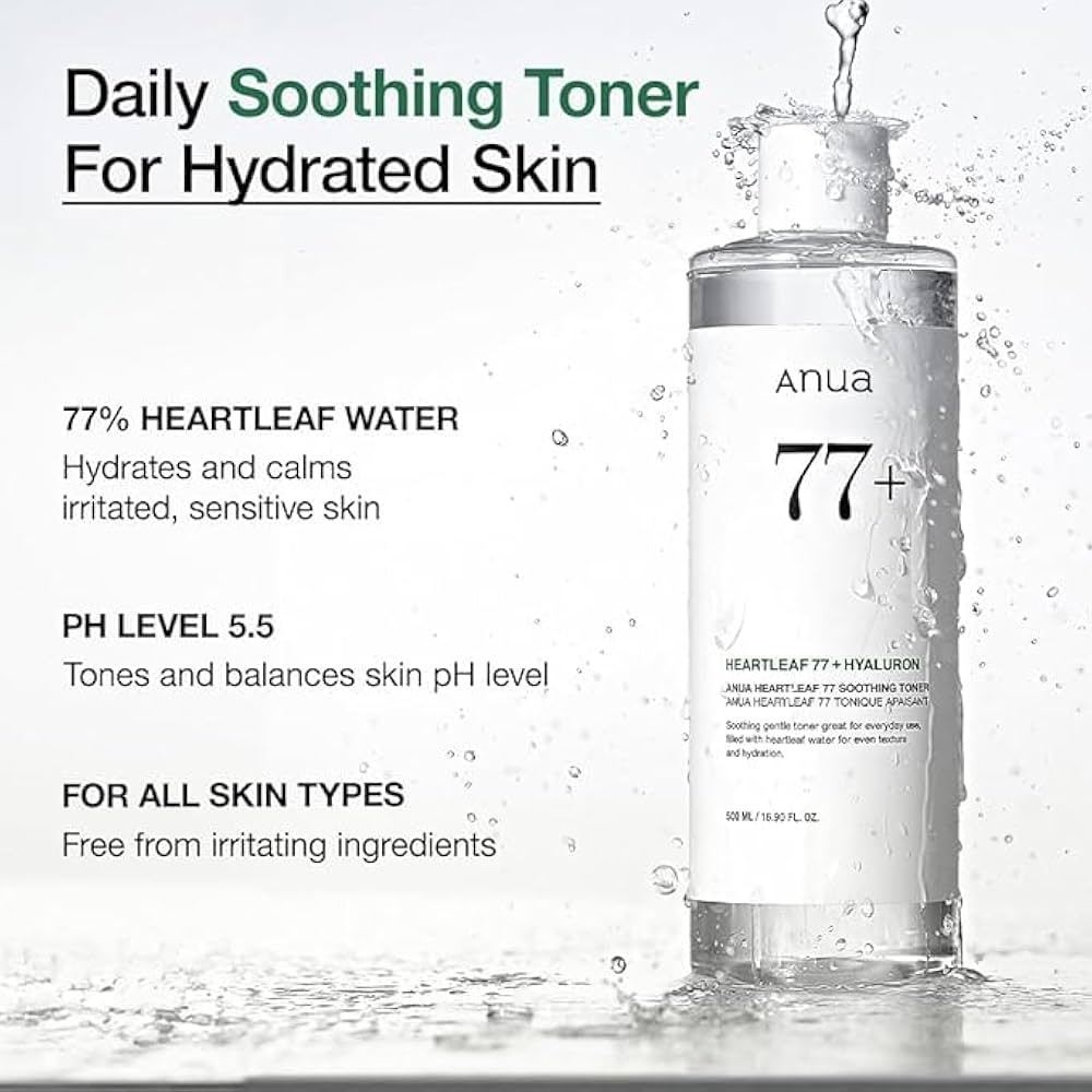 Anua Heartleaf 77% Soothing Toner 250ml is a hydrating and soothing toner that helps calm irritated, sensitive, and sensitized skin. Containing 77% Houttuynia Cordata extract, also known as heartleaf, this toner works to relieve discomfort, reducing redness and heat, while also providing essential moisture. In fact, heartleaf is known for its soothing and balancing properties, making it particularly beneficial for those with sensitive, easily irritated, and even acne-prone skin.