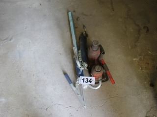 2 BOTTLE JACKS, DRUM PUMP, GREASE GUN