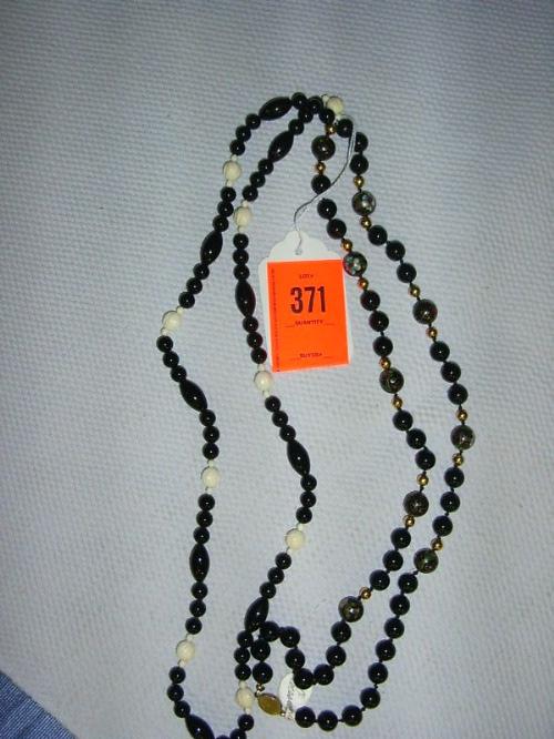 2 black onyx necklaces: 1 with cloisonne accents; 1 with carved bone accents