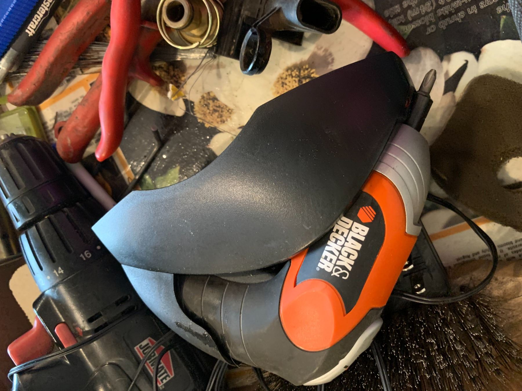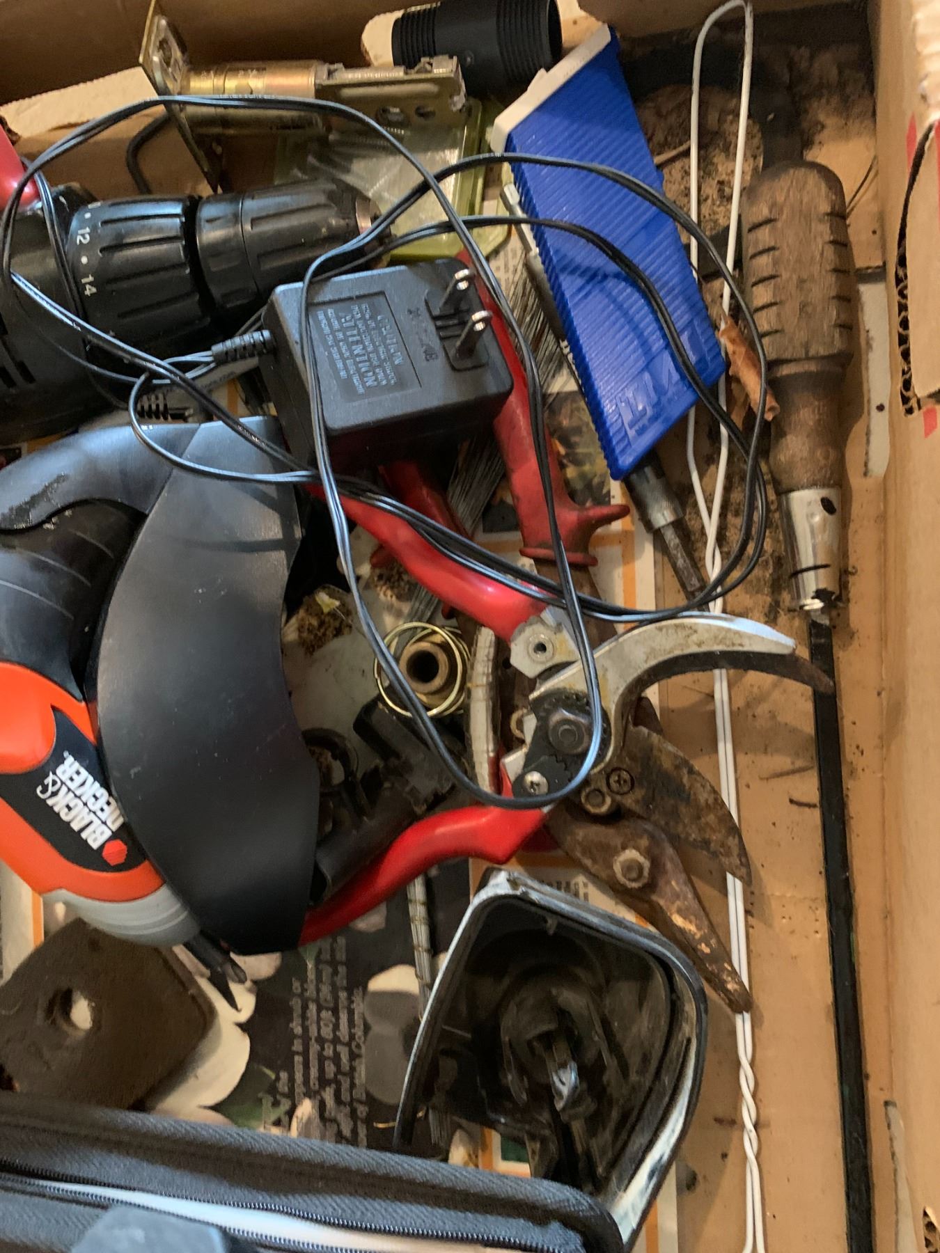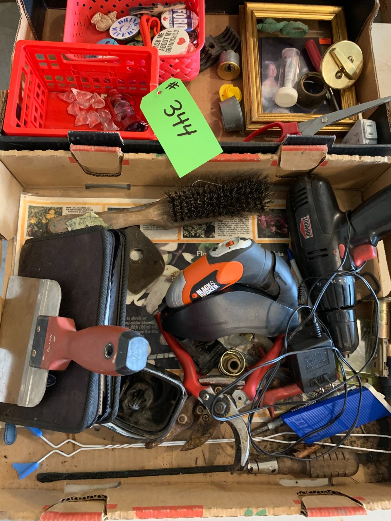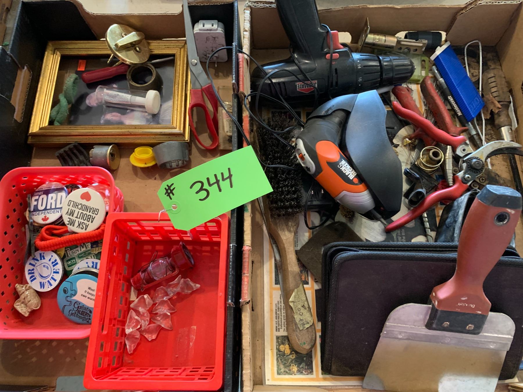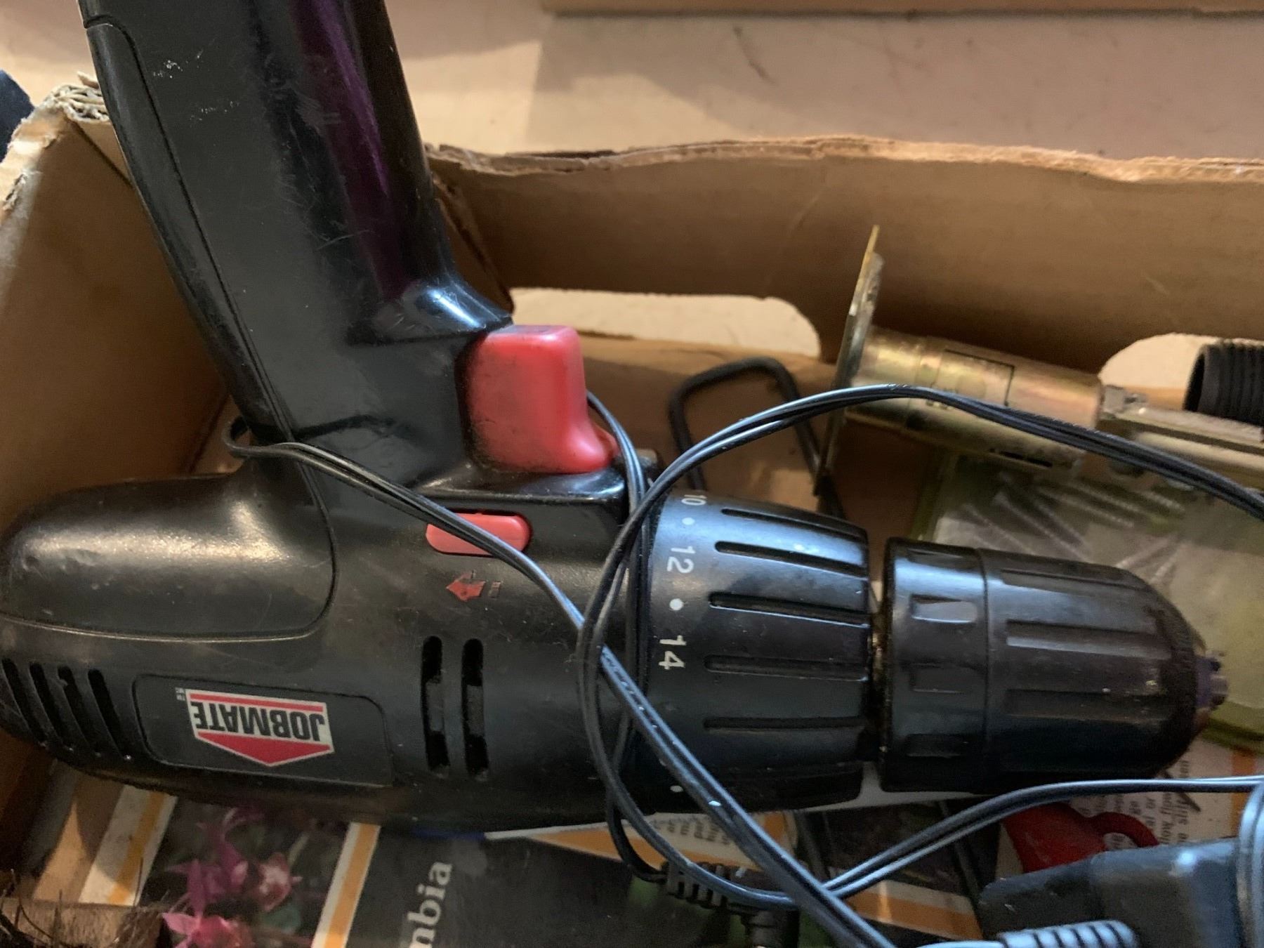 2- Boxes Misc. Jobmate Drill, B&D Small Drill, Brush, Picture Frame, Scissors, Badges, etc.