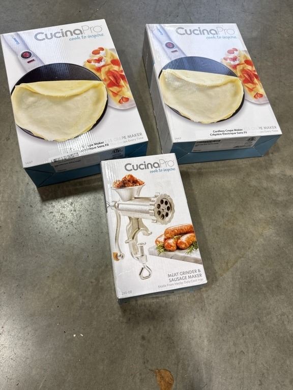 2 CUCINA PRO CORLESS CREPE MAKERS AND CUCINA PRO CAST IRON MEAT GRINDER AND SAUAGE MAKER, PAKAGING MAY VARY