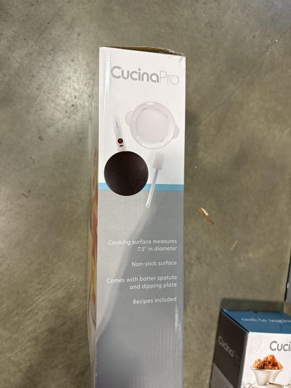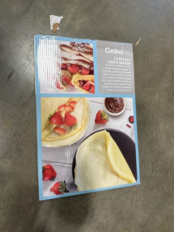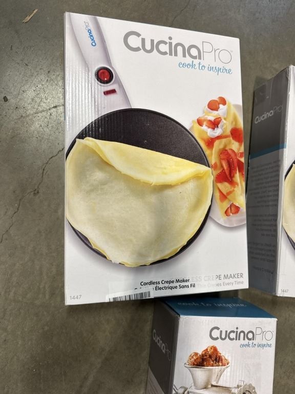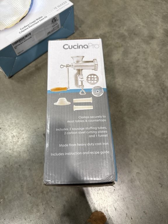 2 CUCINA PRO CORLESS CREPE MAKERS AND CUCINA PRO CAST IRON MEAT GRINDER AND SAUAGE MAKER, PAKAGING M