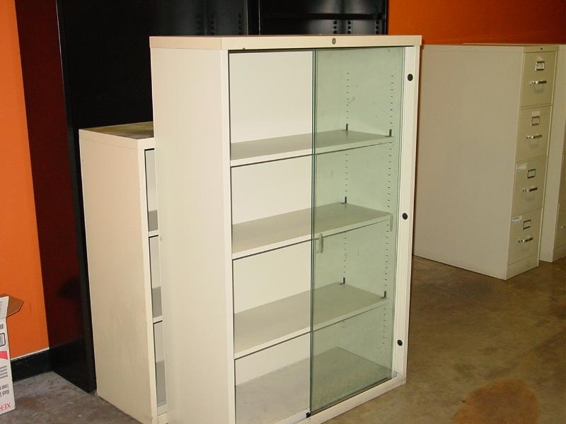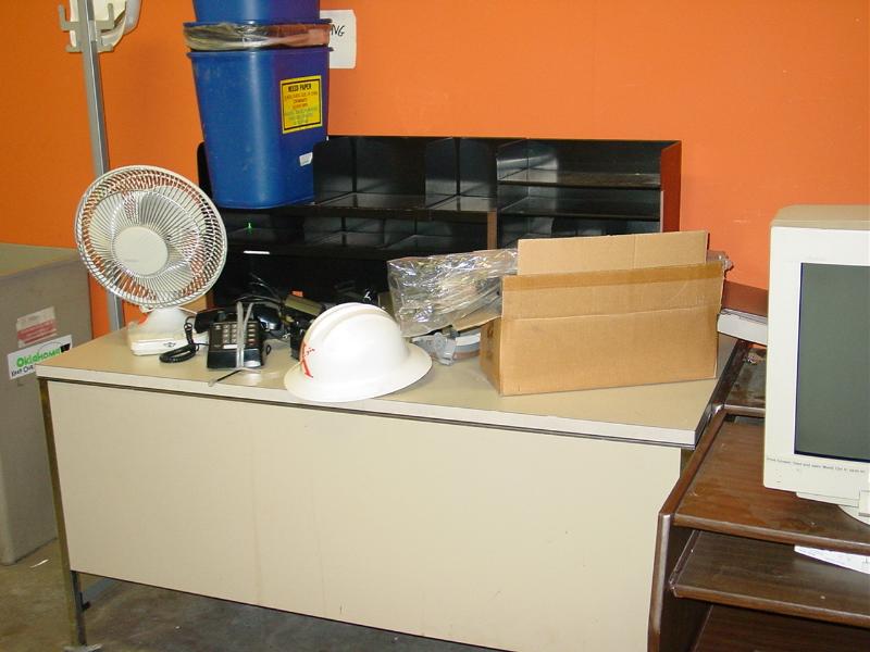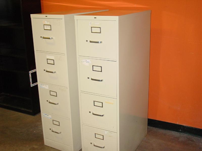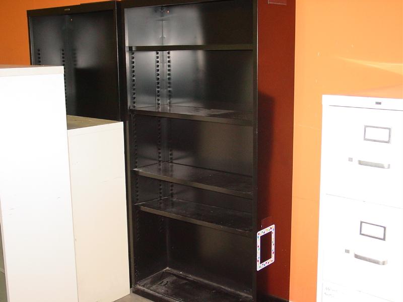 2 DOOR CABINET DESK, 2-4 DRAWER FILE CABINETS, BOOKSHELF, CABINETS (X2), MONITOR, CAN & MISC