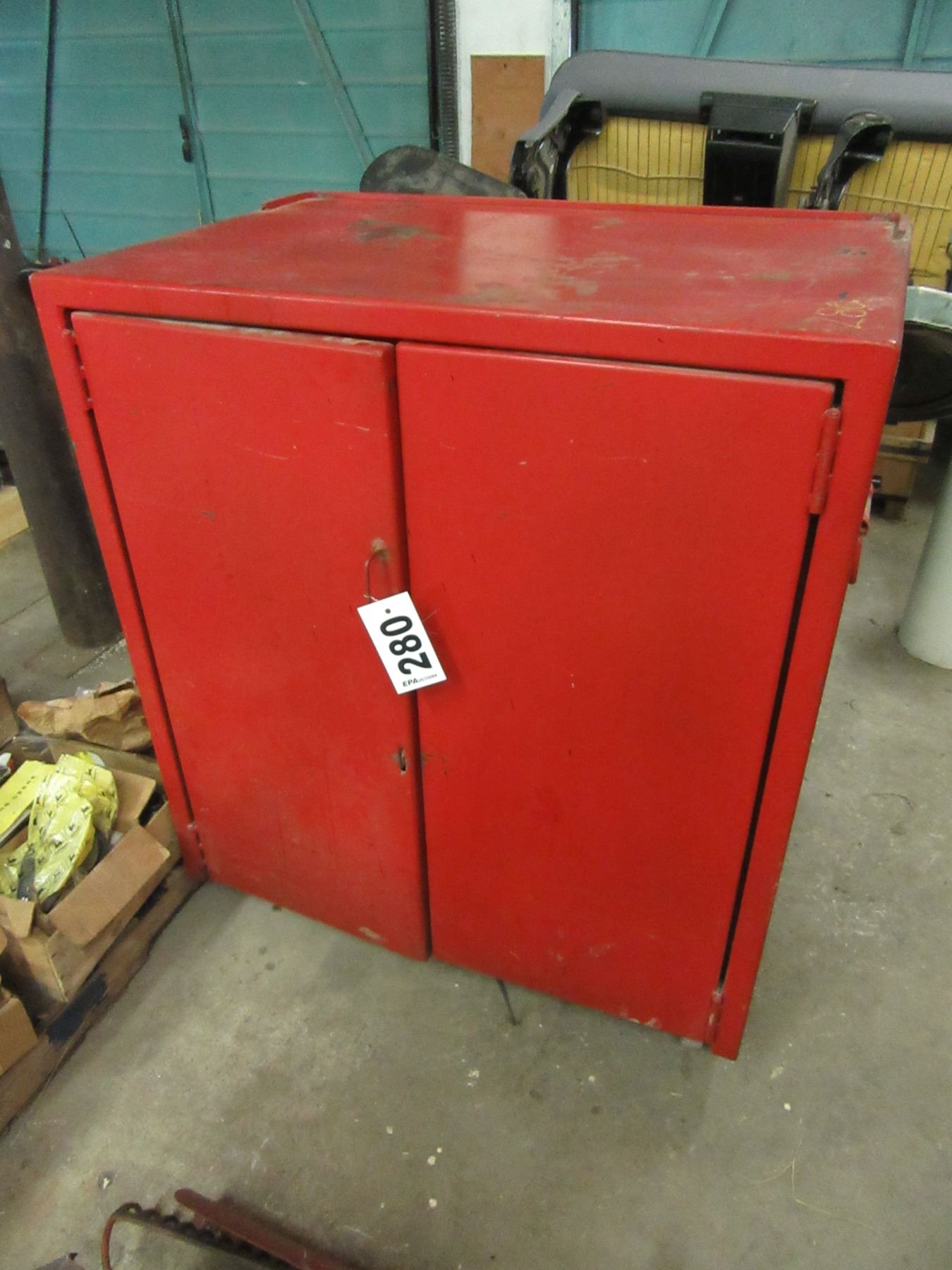 2 DOOR RED METAL ROLLING CABINET & CONTENTS (ELECTRIC MOTOR, PAINT, PARTS, AIR GUN, ETC)