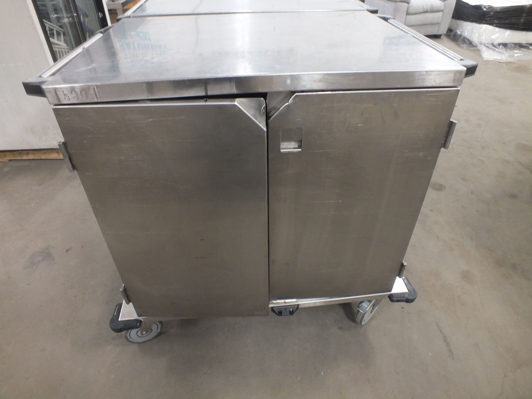 2 Door Stainless Steel Cabinet On Wheels, 36"l 26 1/4"w 40 1/2"h, missing 1 latch...used