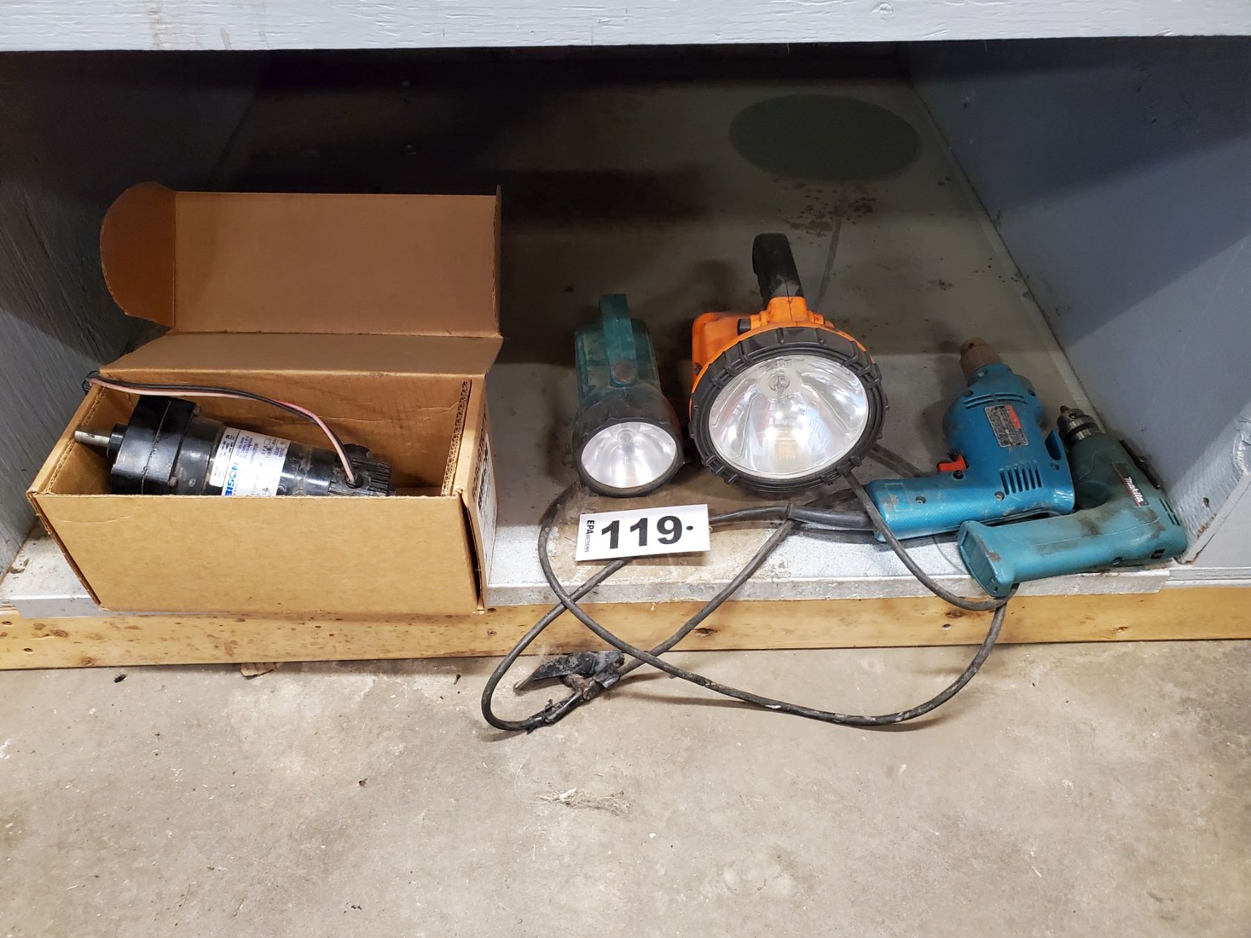 2 ELECTRIC DRILLS & GEAR MOTOR, 2 FLASH LIGHTS