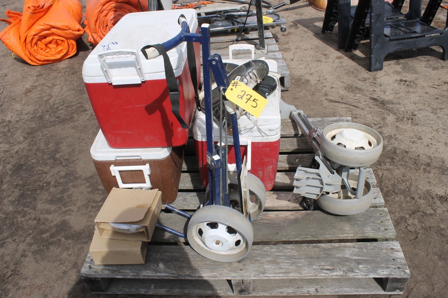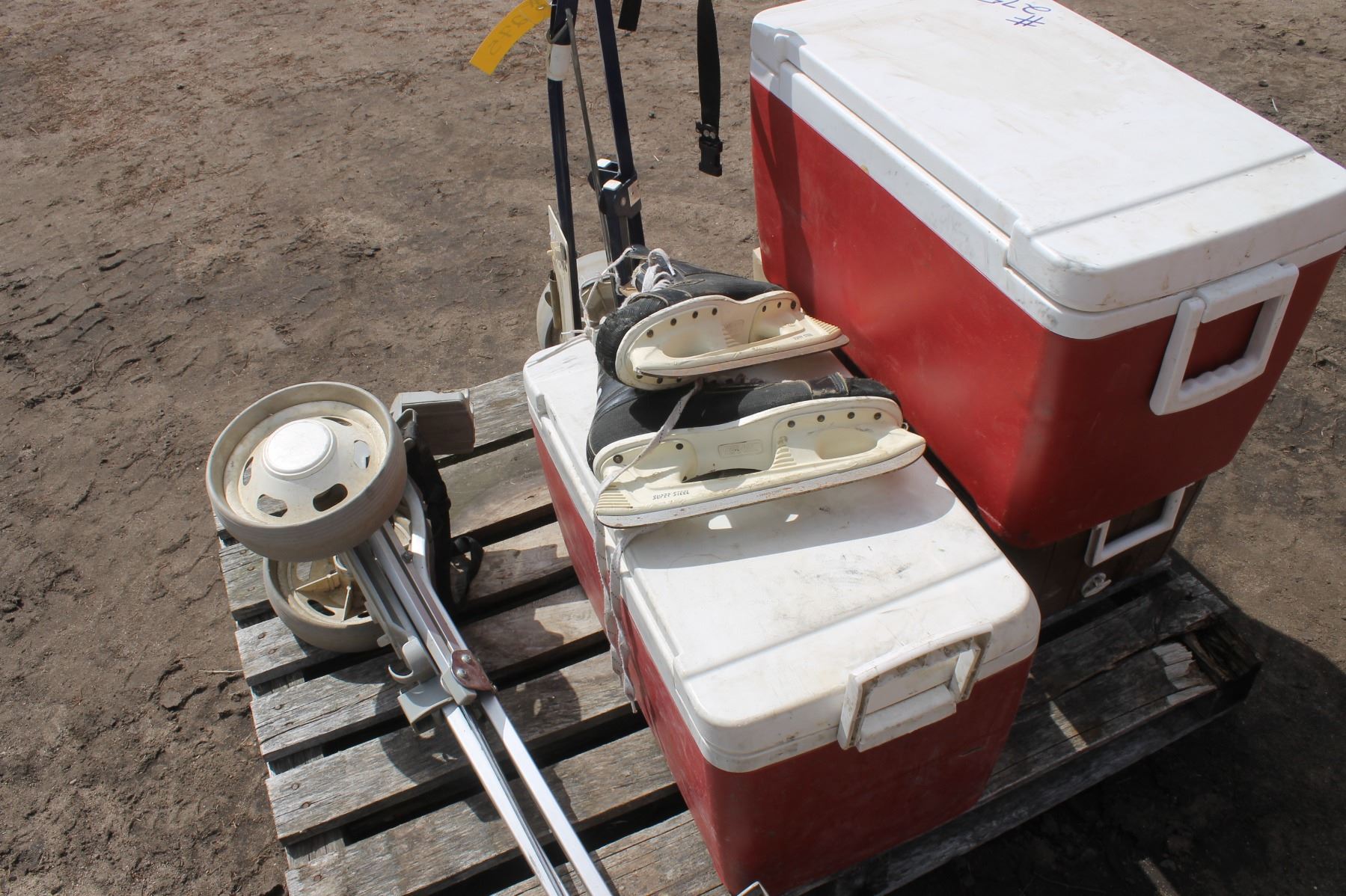 2- Golf Bag Transporters, 3 Coolers and Skates