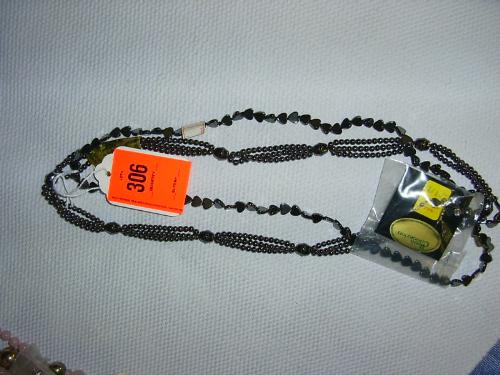 2 fancy hematite necklaces: 1 hearts with earrings; 1 fancy 3 strand 4mm with barrell accent beads.