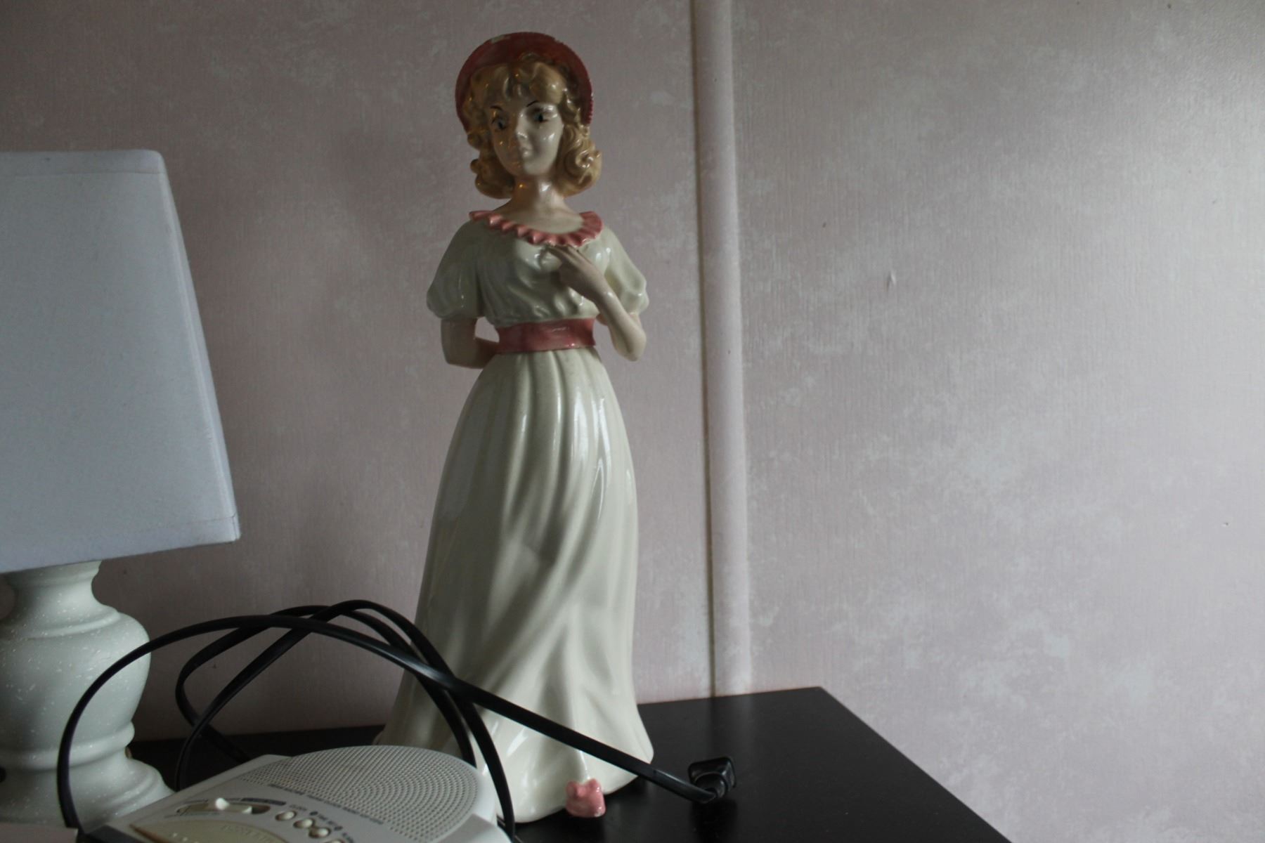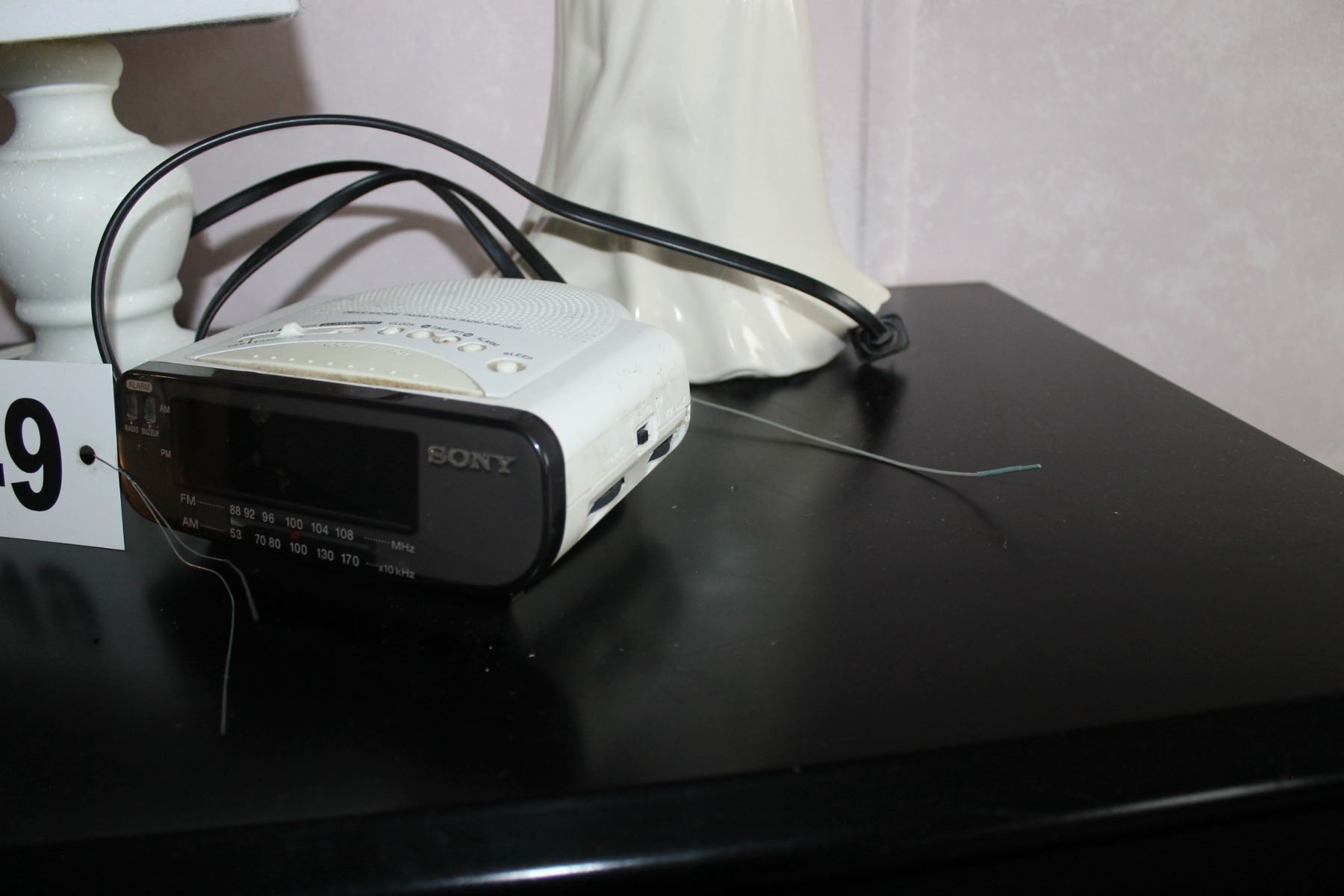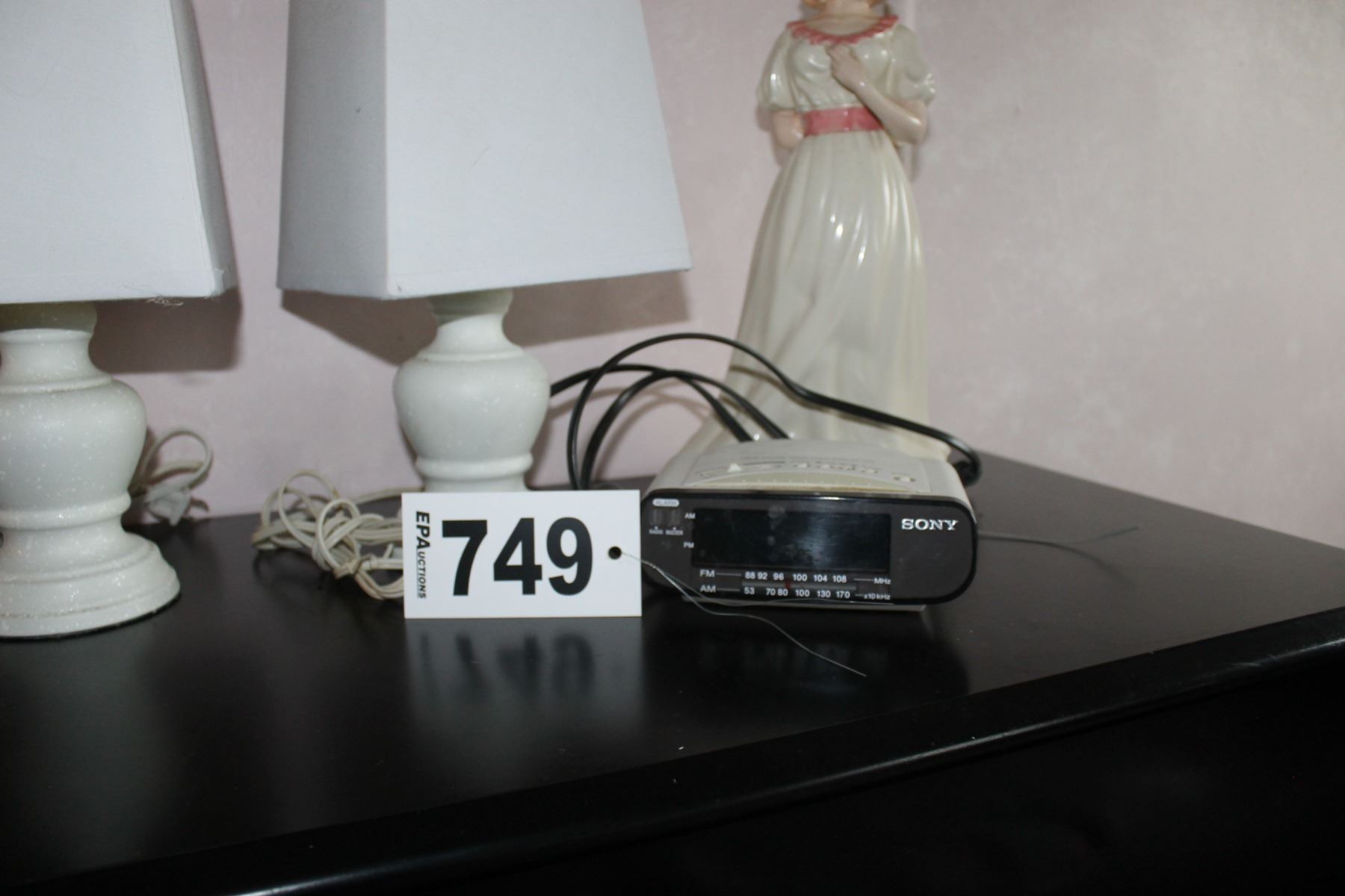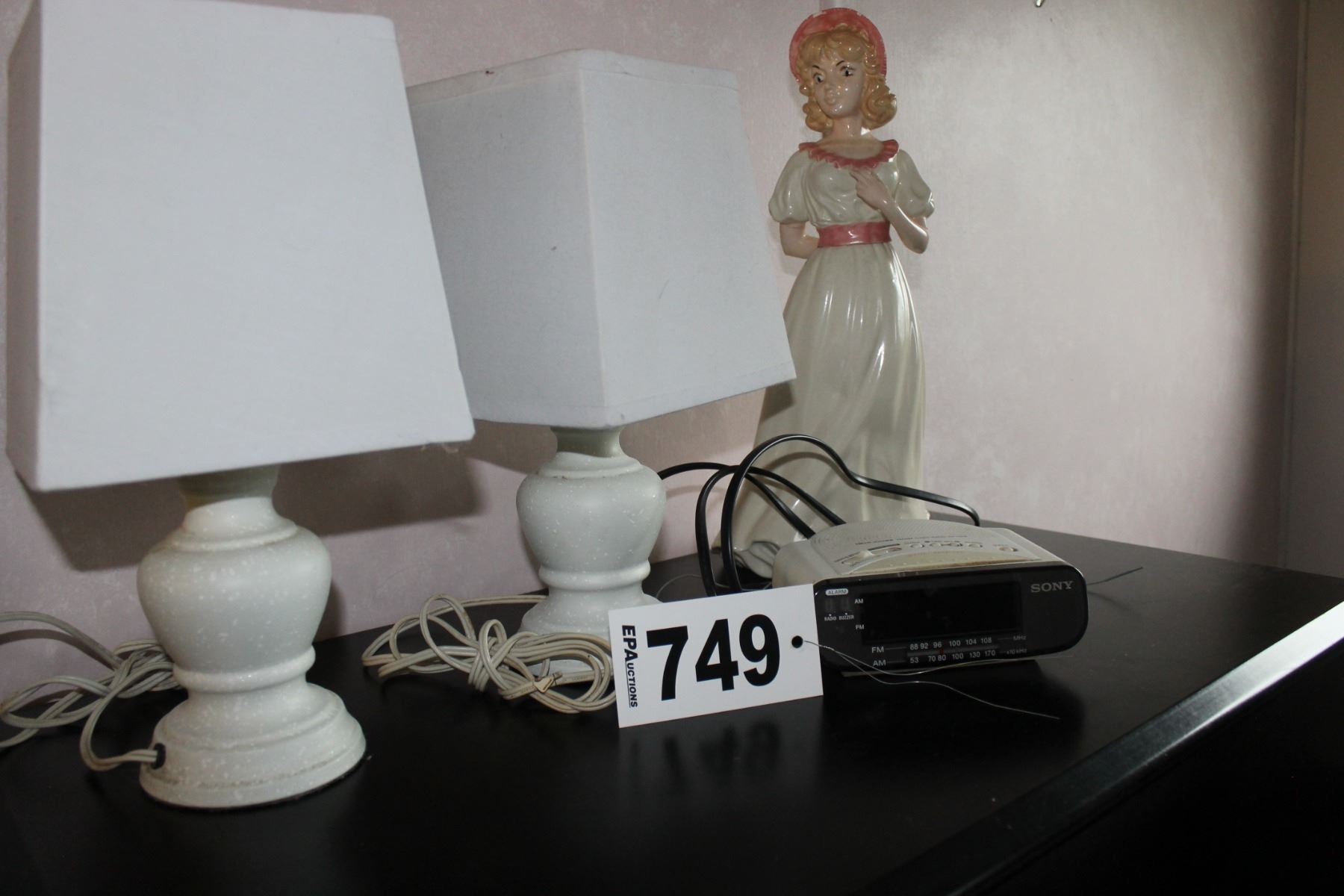 2 LAMPS & SHADES, SONY CLOCK RADIO, CERAMIC LADY FIGURINE