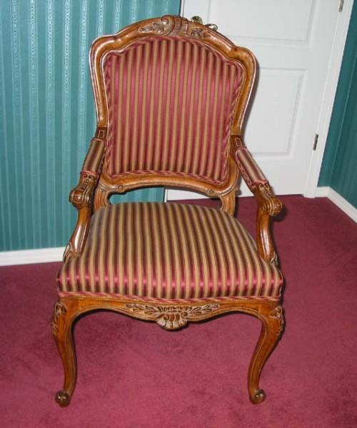 2 Louis XV Style arm chair in hand carved fruit wood (hand made) upholstered in dark red & gold 21" x 24"x 41" - bid will be 2 times the money