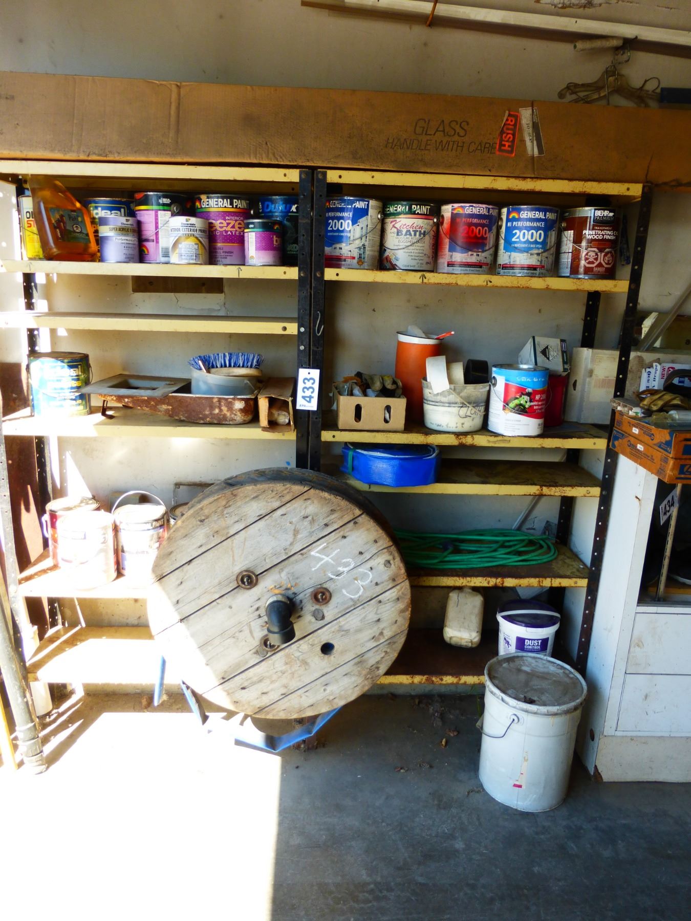 2 METAL SHELVES & CONTENTS INCLUDING WOOD REEL, WATER HOSE, PAINT, ETC