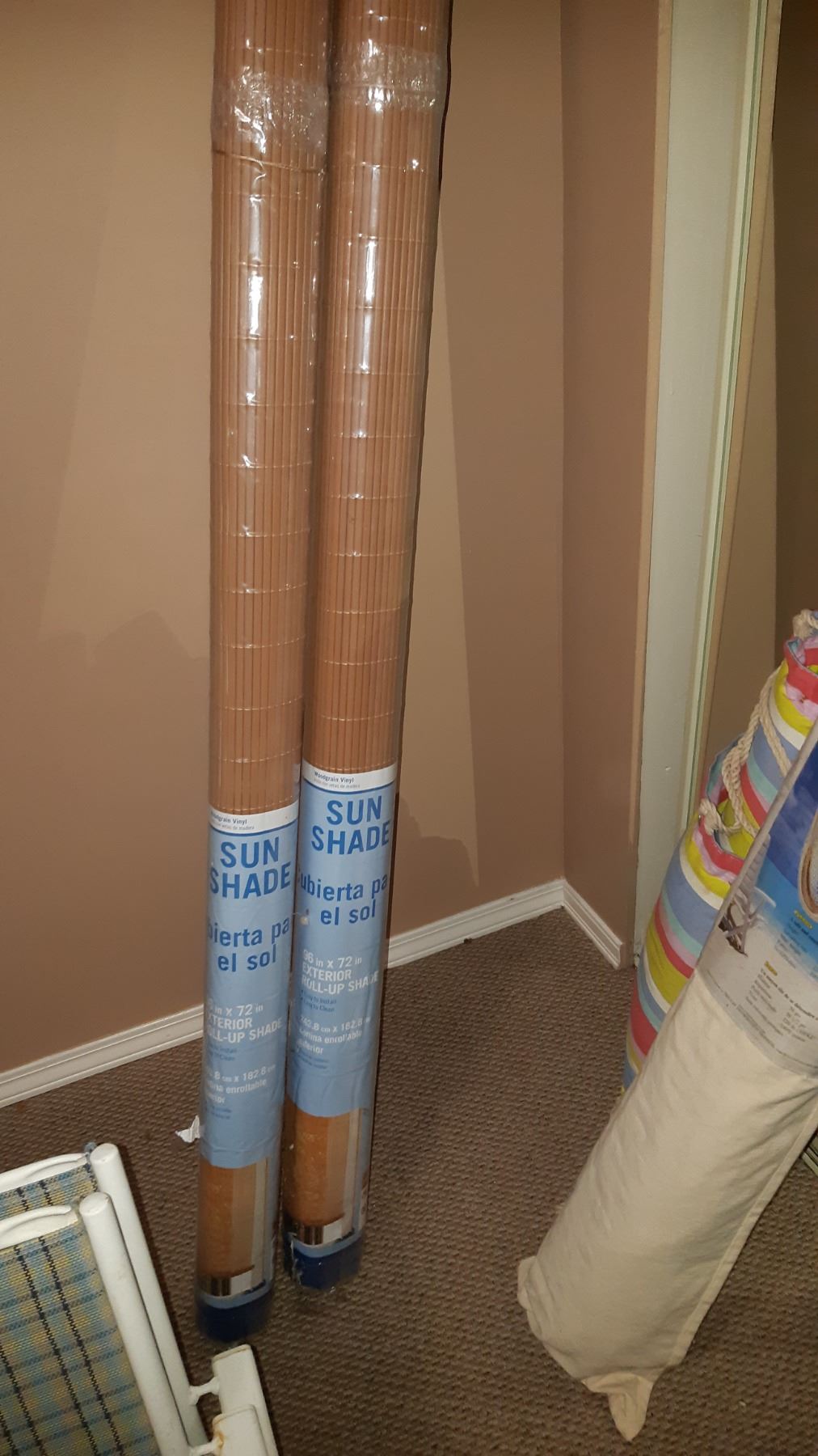 96x72. Tow new wood grain vinyl roll up shades. Pick up at 11am.