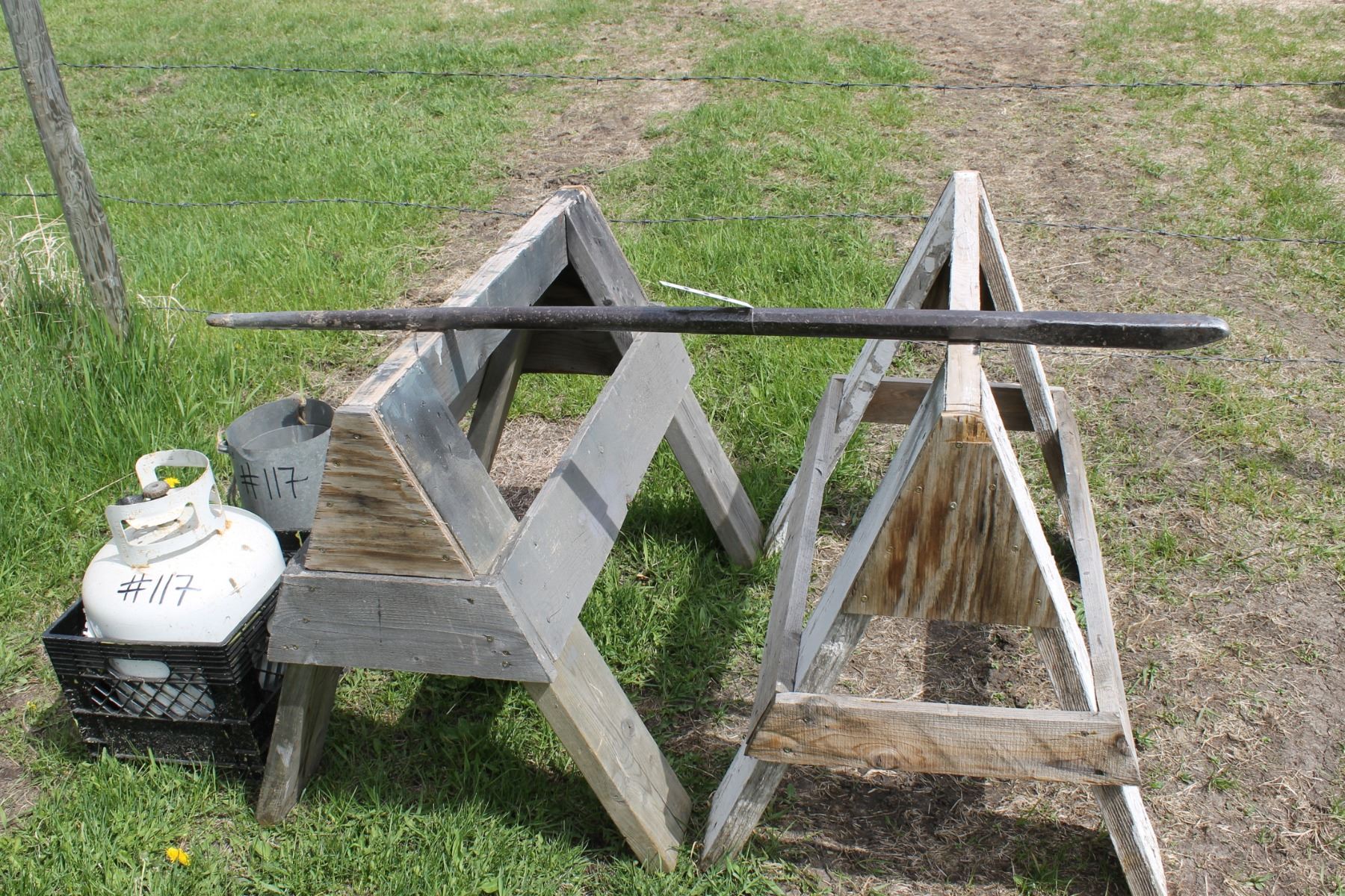2 SAW HORSES, BAR, FULL PROPANE BOTTLE & AUGER SPOUT
