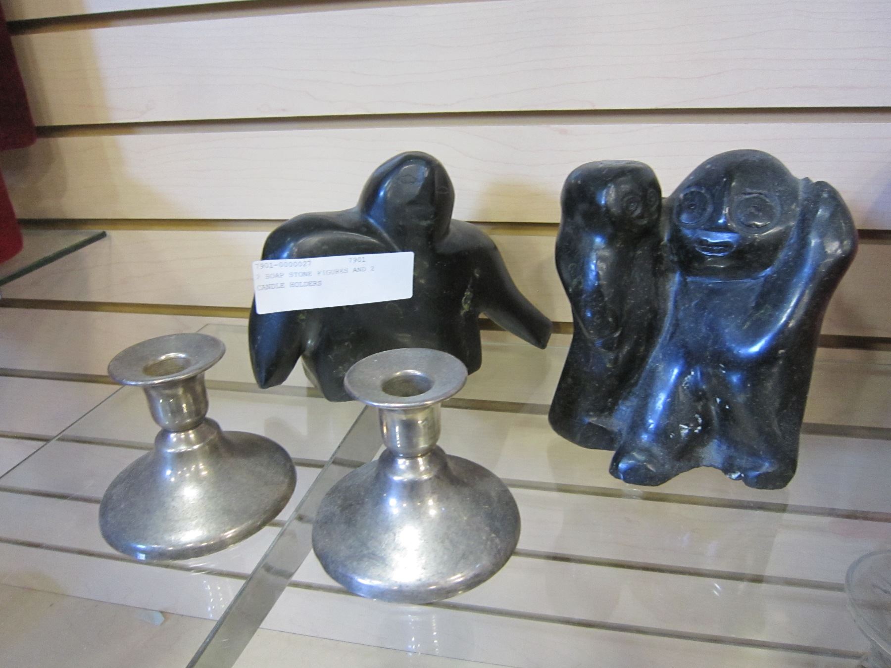 2 SOAP STONE FIGURES AND 2 CANDLE HOLDERS