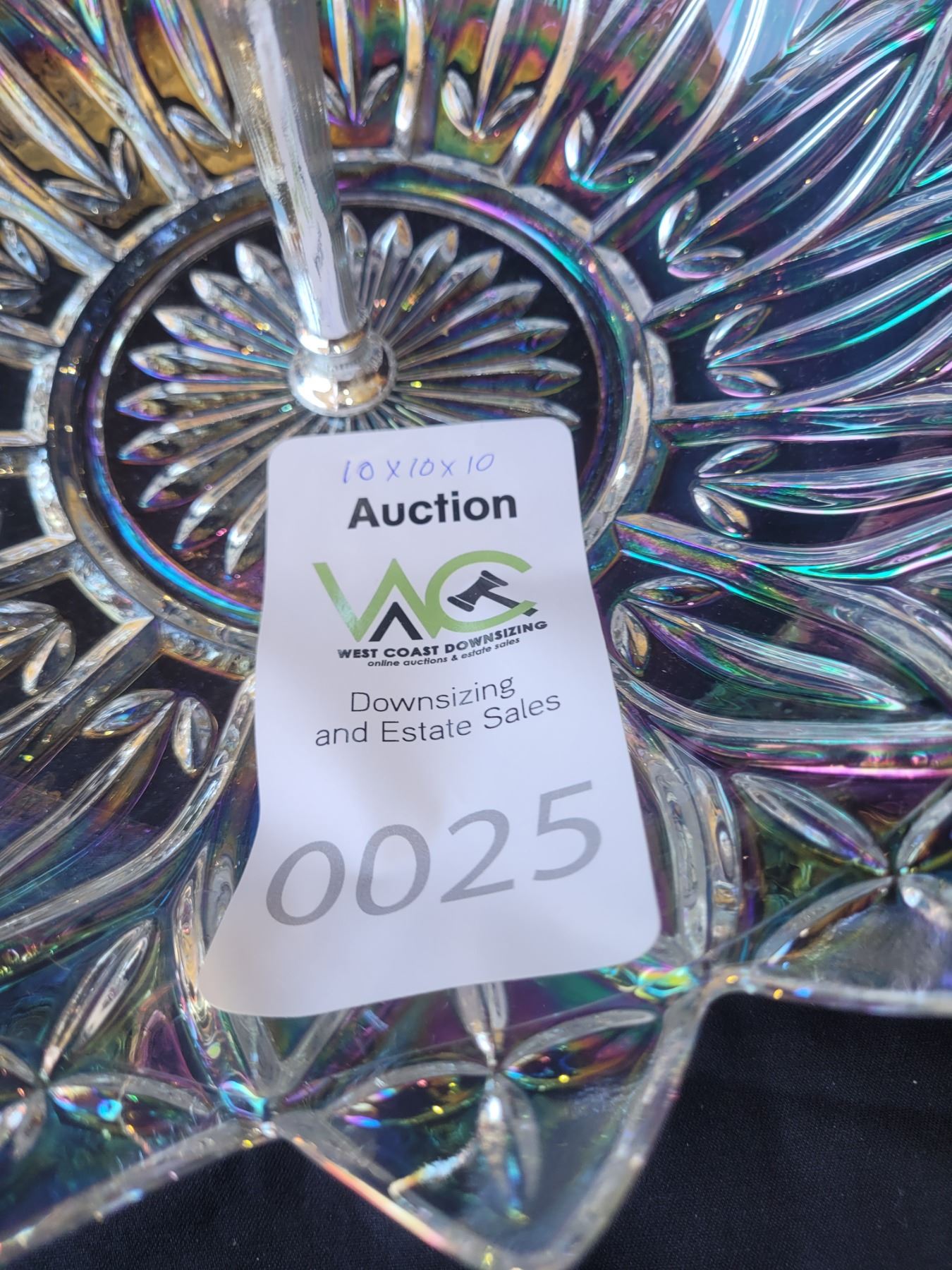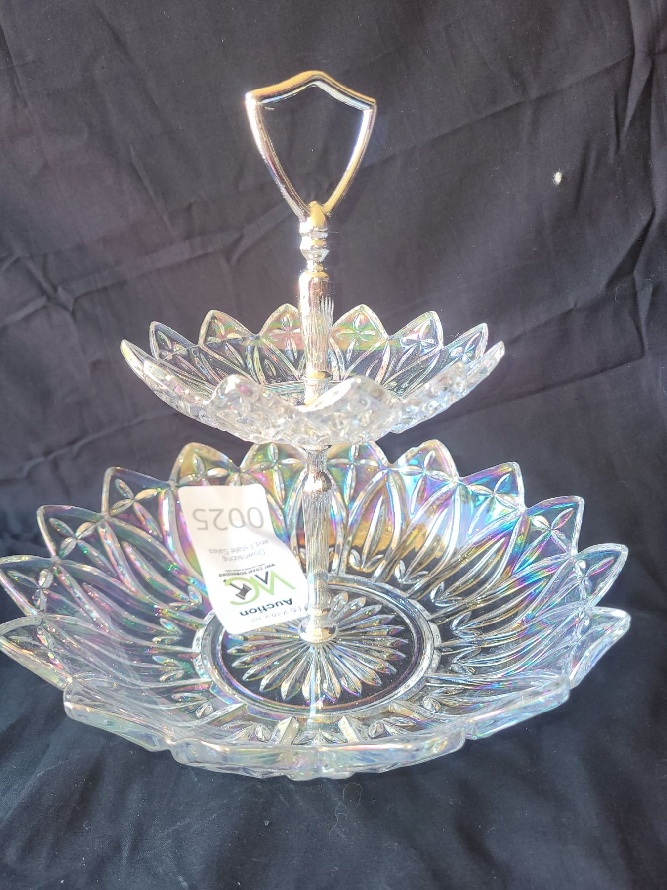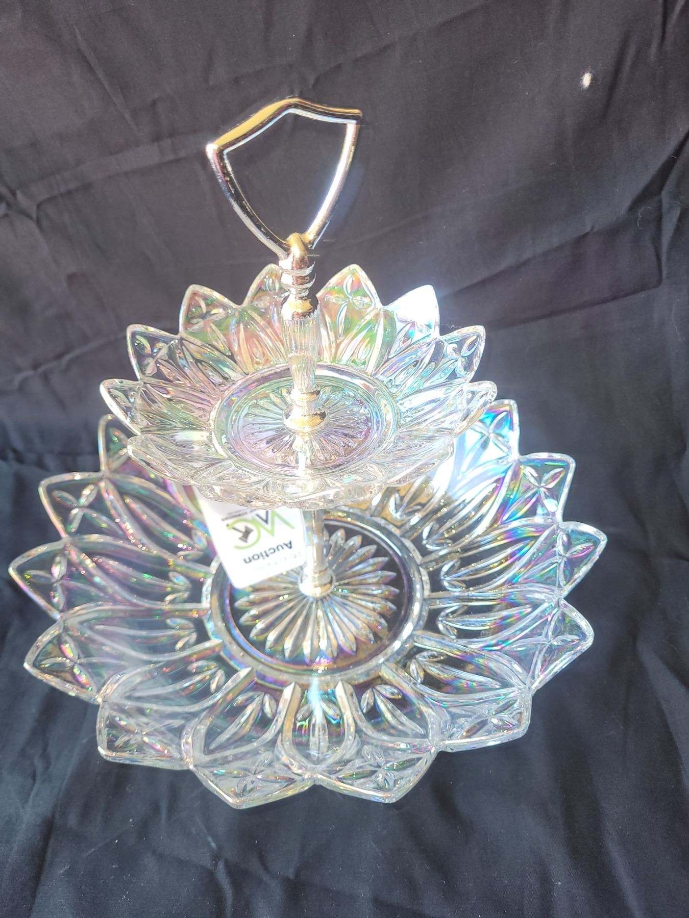 Irrisdescent glass candy dish, with metal handle 10x10x10. Pickup at 9 am