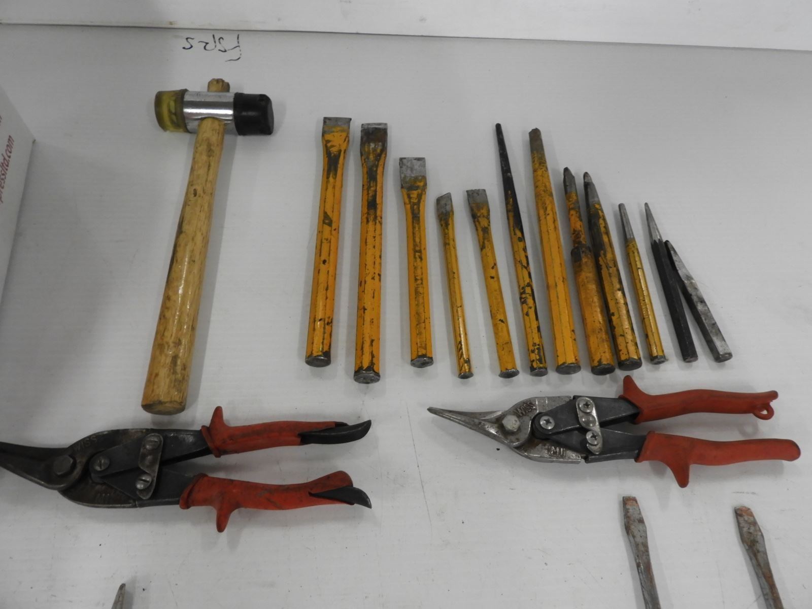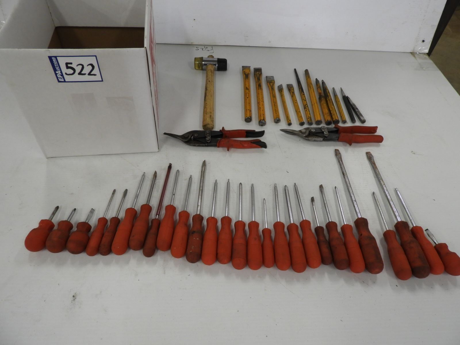 (2) Tin snips, soft blow hammer, (12) chisels and punches, (28 piece) screwdriver set