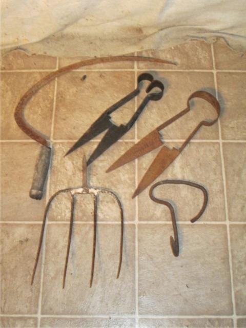 2 Vintage Shears, Meat Hook , Sickle, & Pitch Fork