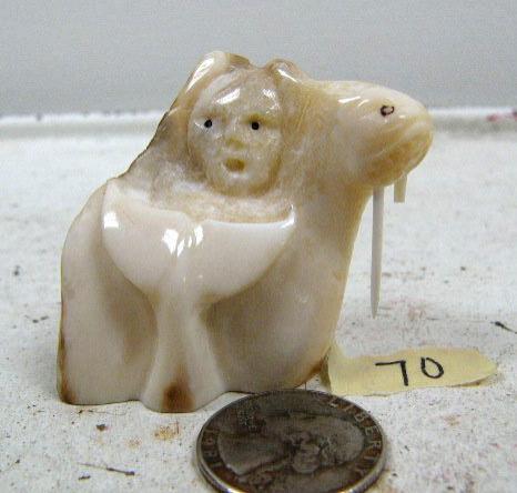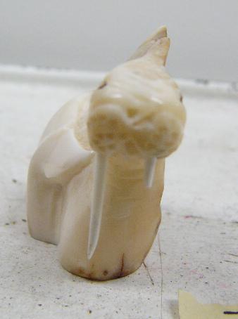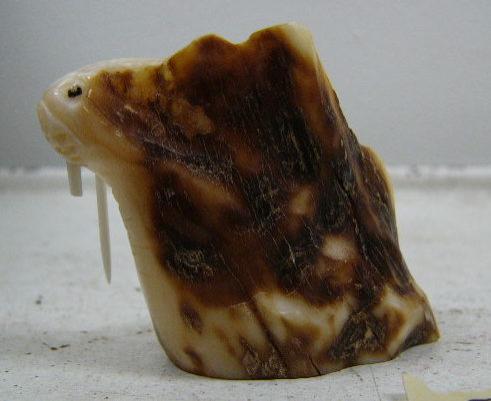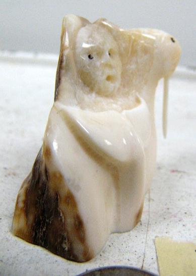 2" fossilized walrus ivory carving of walrus, whale's tail, and man by Iglaak of Koyuk (114)