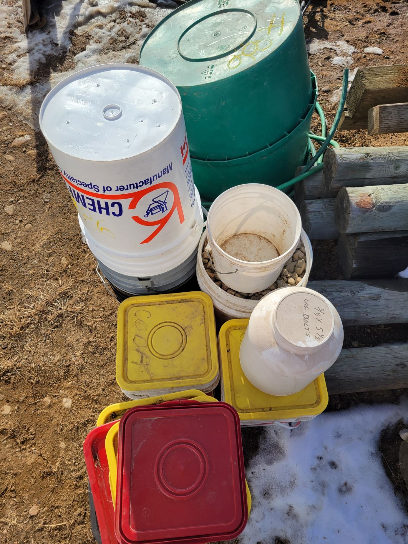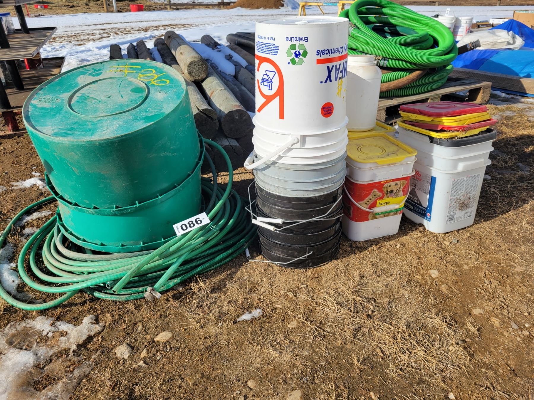 2 horse mineral tubs; various length garden hose; 5 gallon plastic pails - square plastic pails; 5 gallon pail of crushed rock