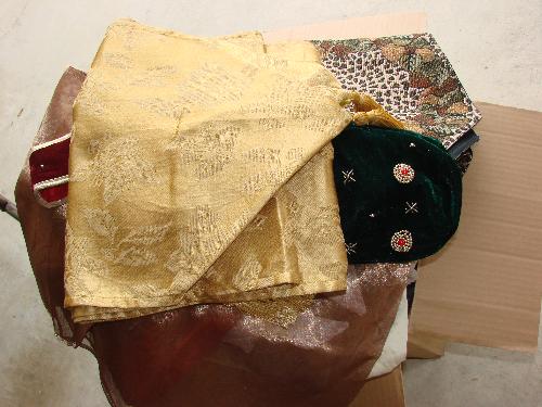 2 boxes filled with linens, tablerunner, sheets, wine bags
