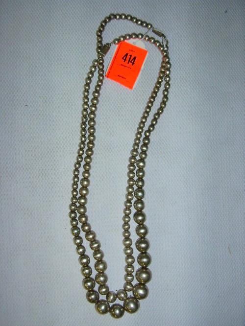 2 graduated size necklaces of 113 grams of 92.5 Taxco, Mexico silver: 1 graduated from 20mm to 8mm, 28" long; 1 graduated from 16mm to 8mm, 30" long