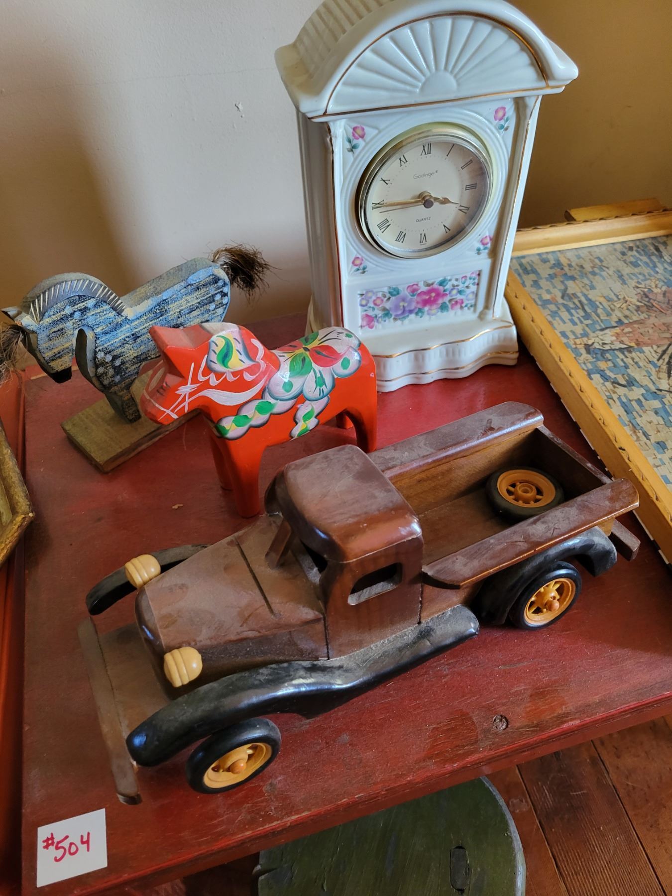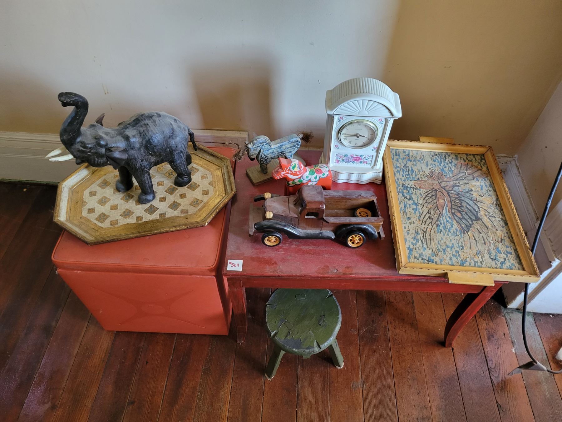 2- stools, storage box stool, 2- serving trays, sign, mantle clock and ornaments