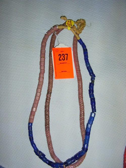 2 strands: One strand pink glass 'snake' beads. One strand faceted glass 'tile' beads.