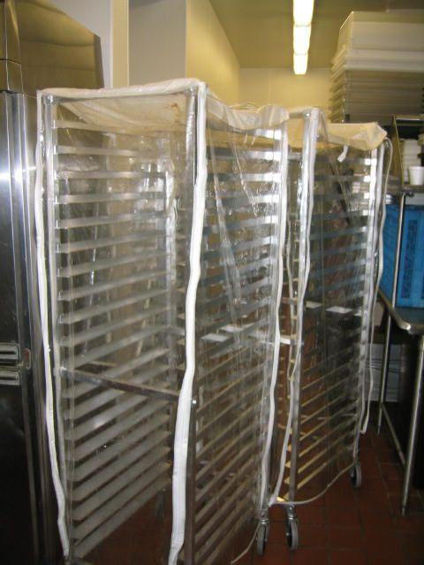20 tray aluminum pastry rack on casters approx 69" tall, 26" wide, 20" deep. Comes with 20 trays. Has plastic heat shroud.