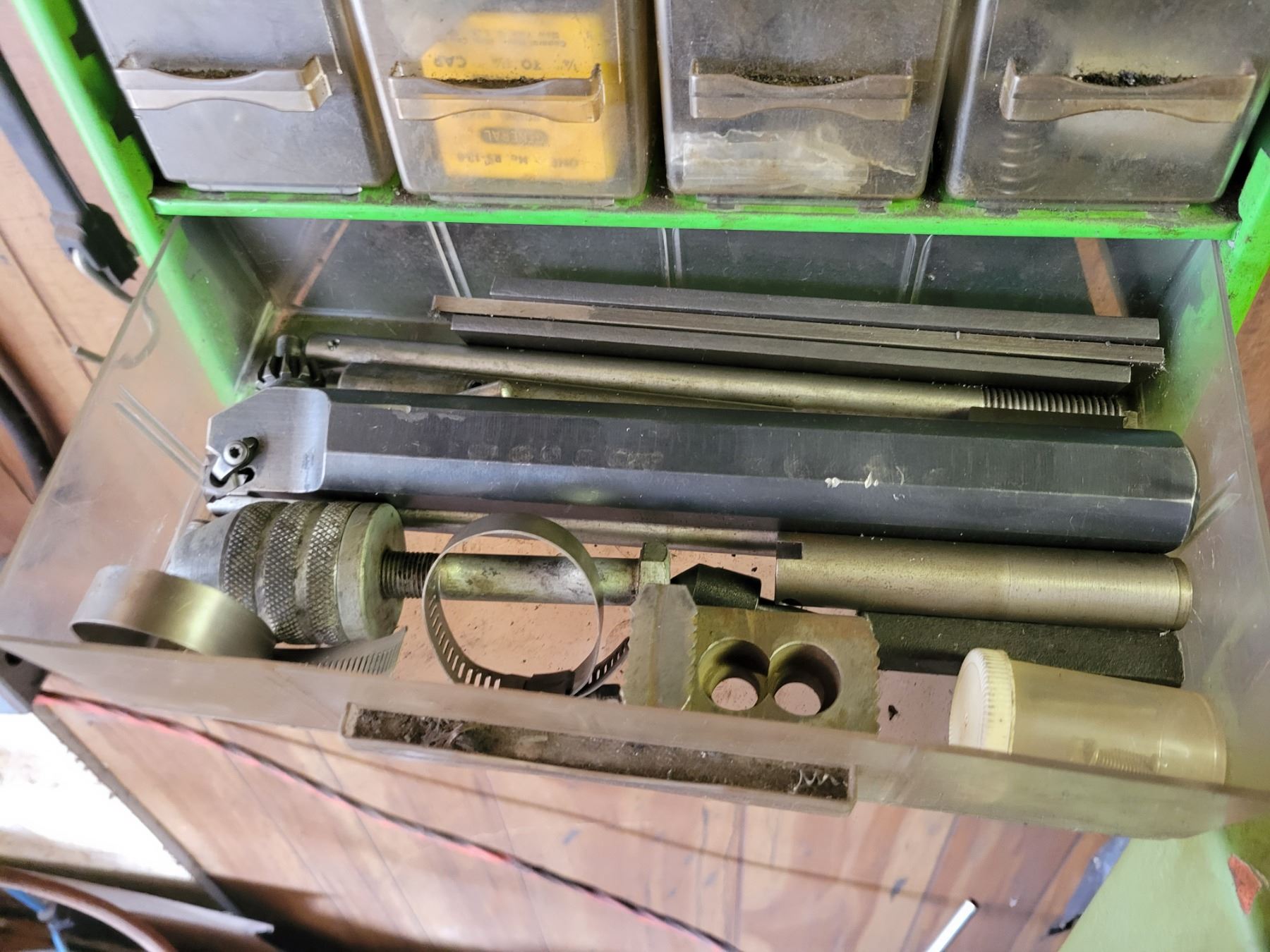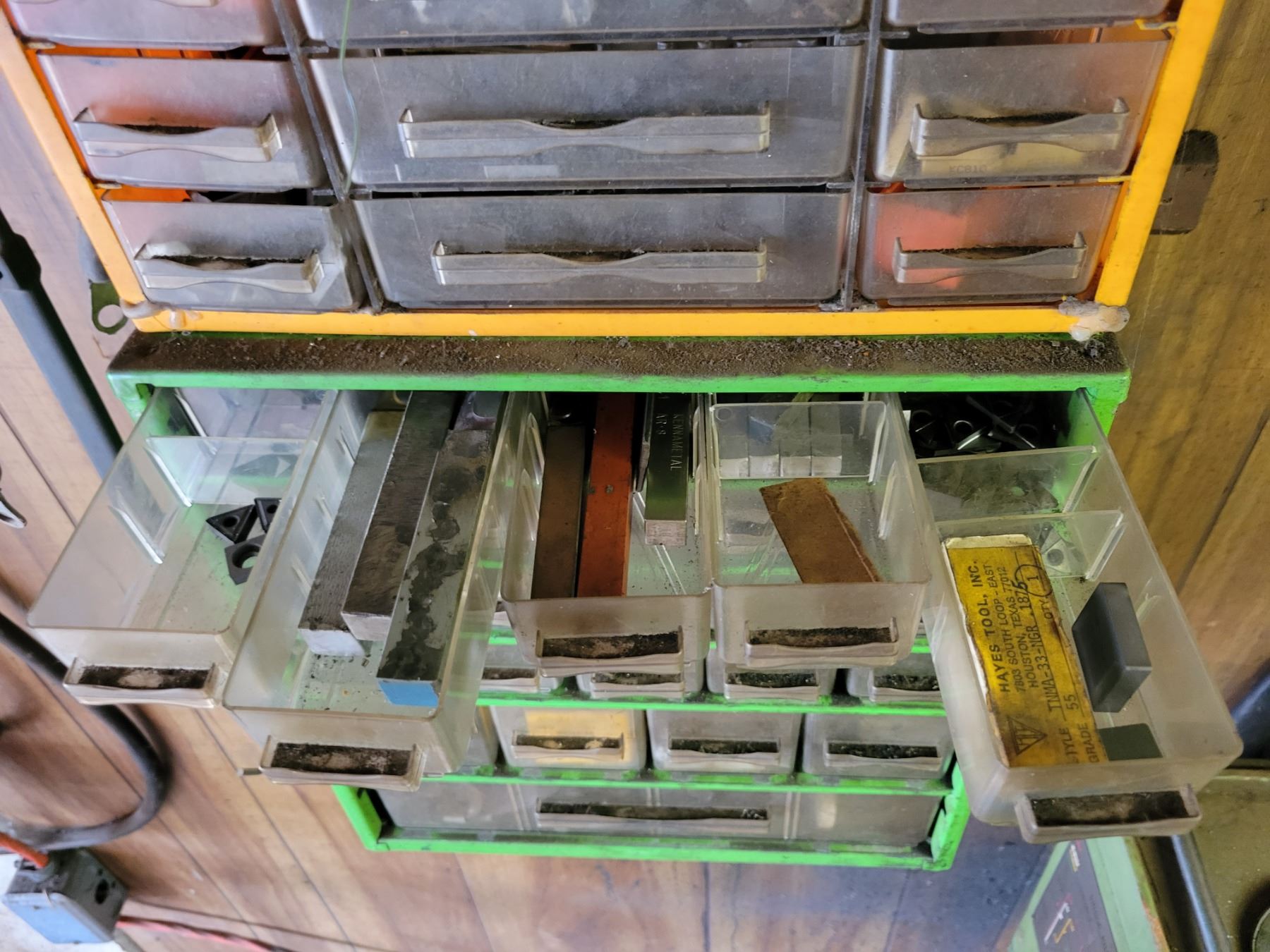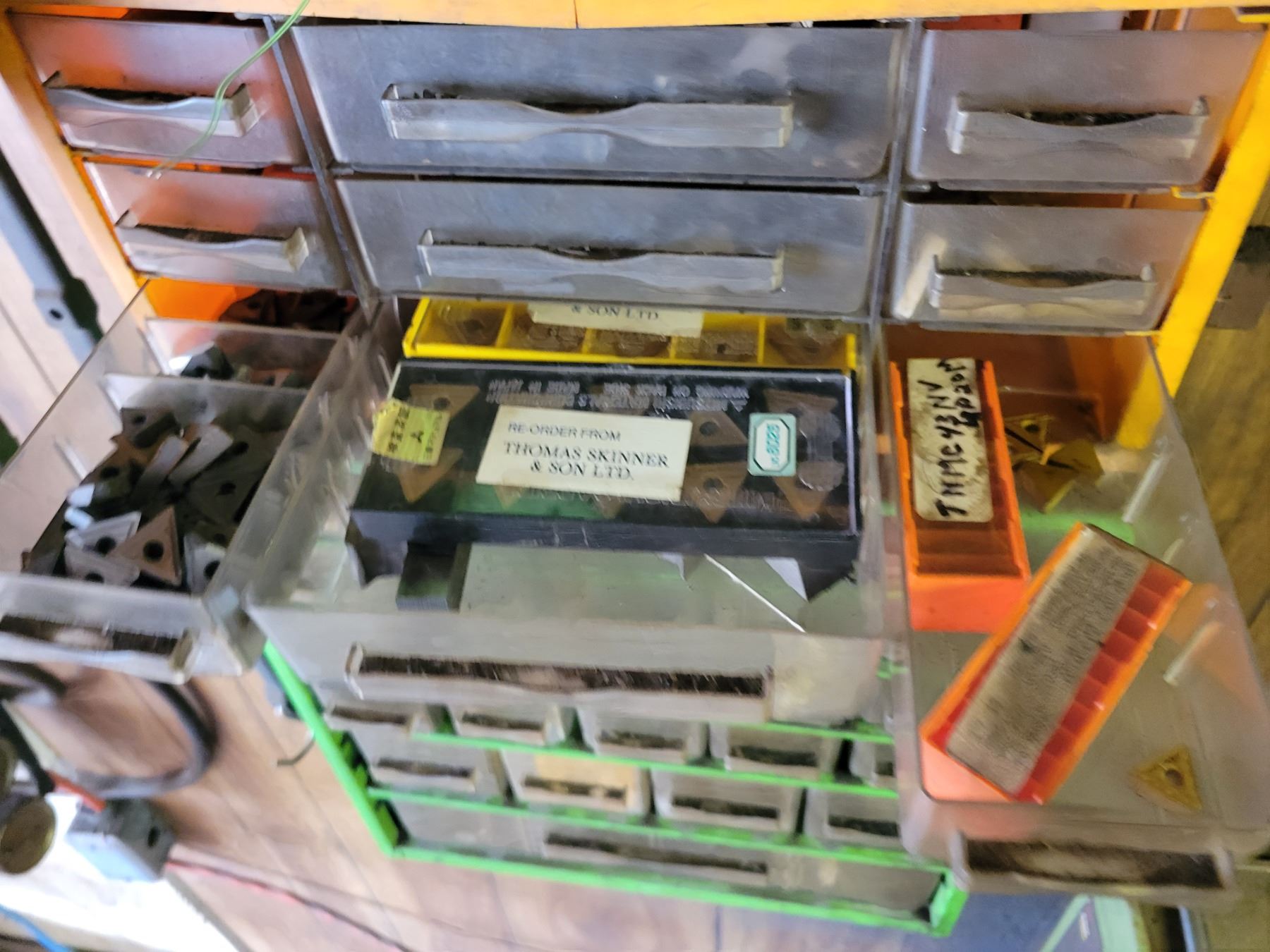 20 drawer tool storage unit and 9 drawer tool storage unit. Both containing qty of NEW inserts, center drill bits, fittings, lathe supplies etc.