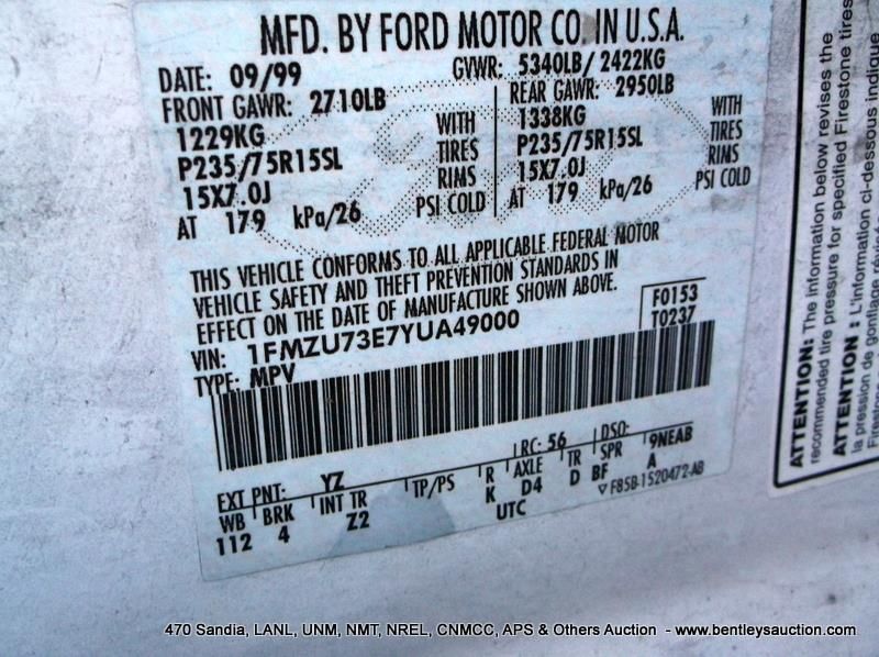 2000 FORD EXPLORER, 4WD ~ 170,702 MILES VIN: 1FMZU73E7YUA49000, SUV, 4WD, V6, 4.0L 1 KEY 1 FOB TITLE