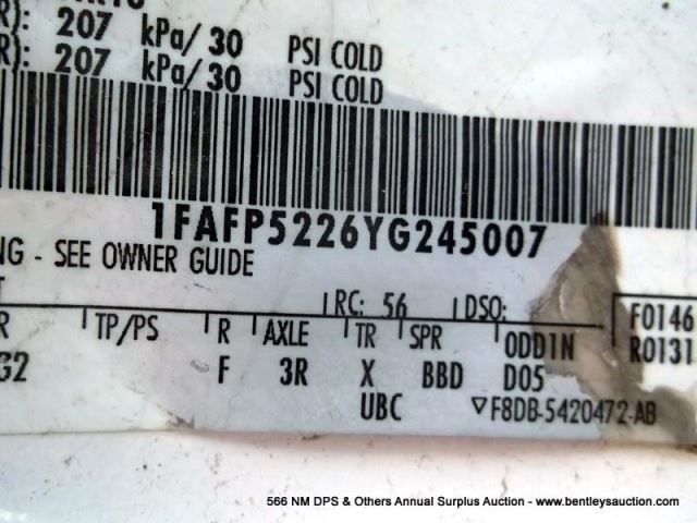 2000 FORD TAURUS ~ 102,168 MILES VIN: 1FAFP5226YG245007, SEDAN, FWD, V6, 3.0L, WHITE, AC COLD, 1/4 TANK GAS, CSF TITLE #: 16203134A969216 3 KEYS FA-28499 G45948
