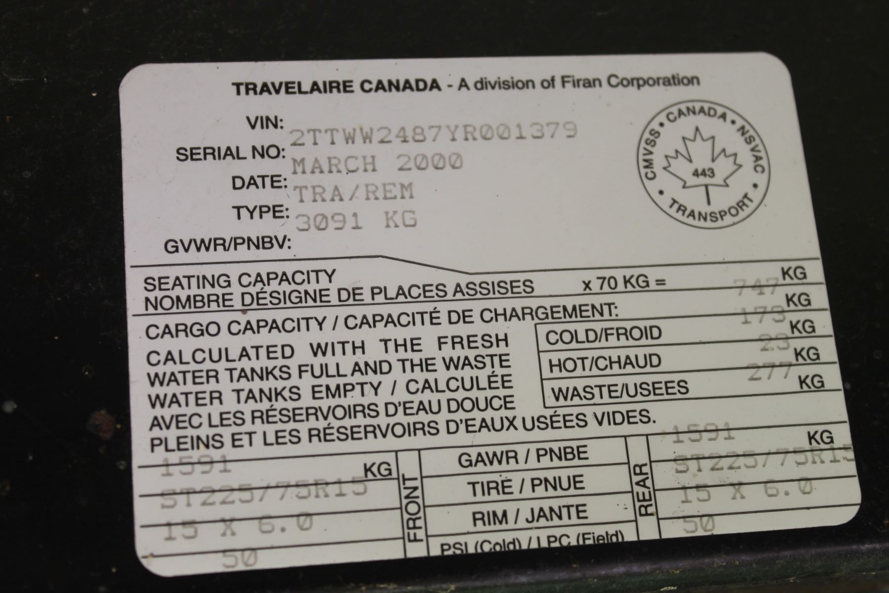 AIR CONDITIONING; NEW AWNING; 12 VOLT JACK; C/W ALL CONTENTS; SHEDDED; EXTRA CLEAN; VERY NICE CONDITION; ORIGINAL OWNER; HAIL DAMAGE TO DRIVER'S SIDE; SN #2TTWW2487YR001379