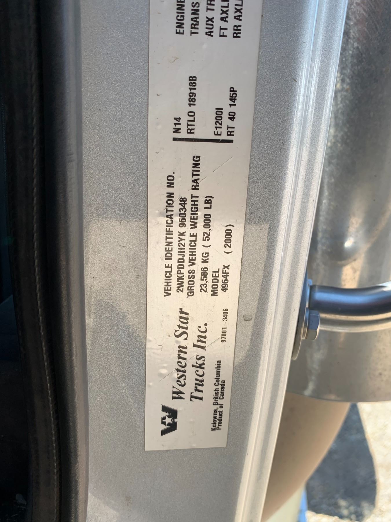 2000 Western Star N14, 18 spd, 275/80R24.5 tires, new frt tires, alum. Frt bumper, wet kit, showing 324,411 kms, SN. 2WKPDDJH2YK960348
